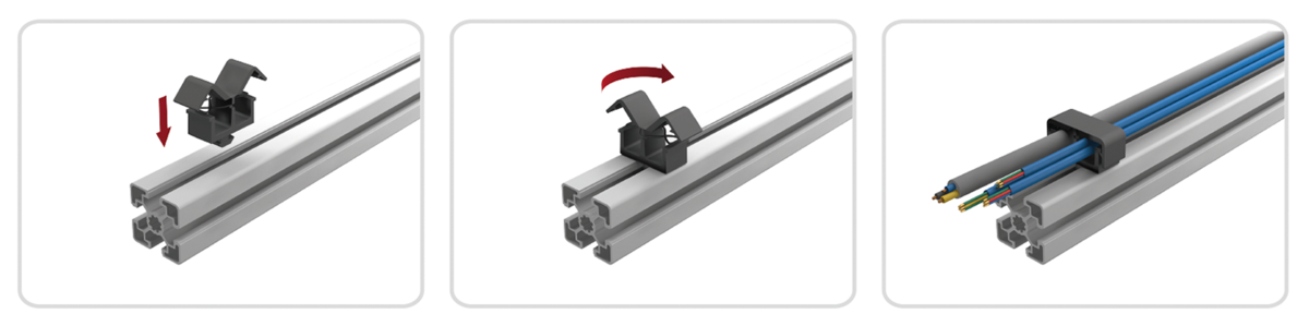 The clip is mounted by inserting the T-key into a T-slot and twisting through 90°. The cables are held in place by the stretched O-ring.