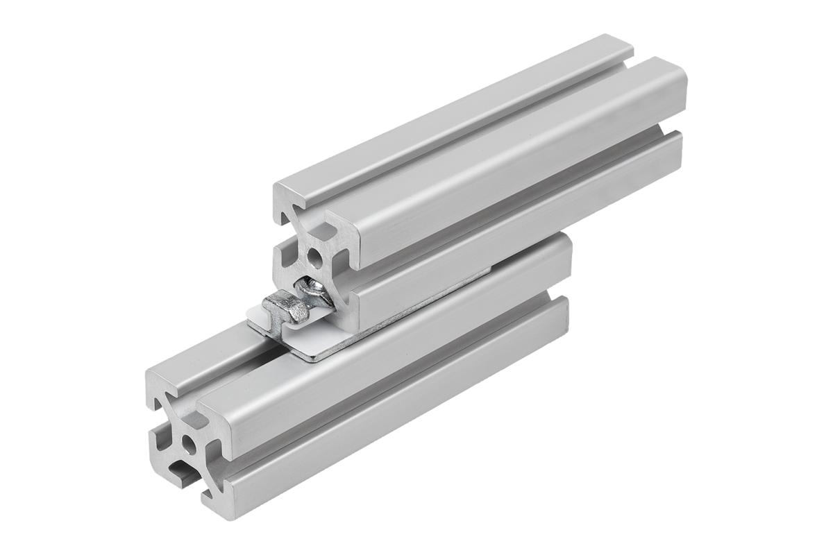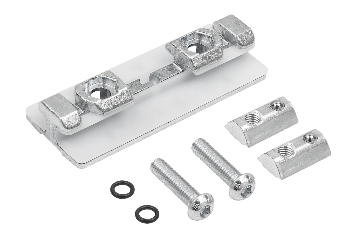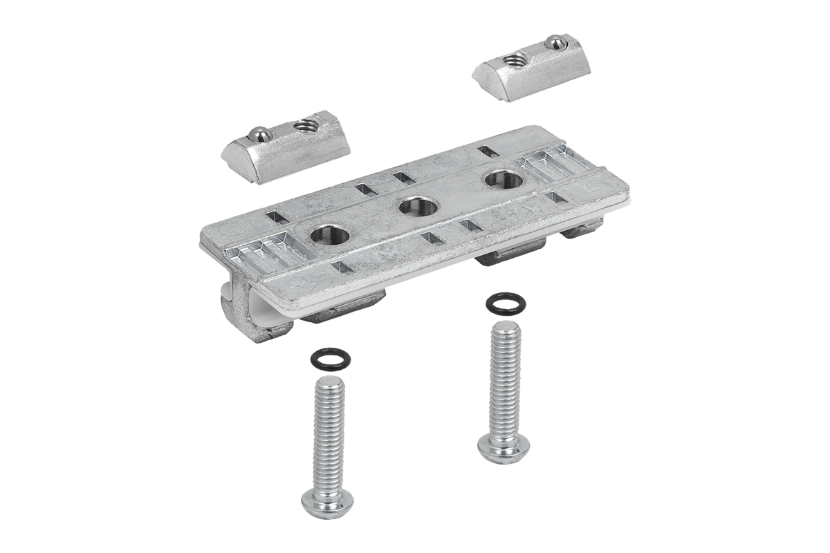 Metal profile slider with clipped-on plastic slide element. Profile sliders enable low-wear linear movement of type I aluminium profiles with 8 mm slots. The absence of lubrication makes the system extremely insensitive to dirt.