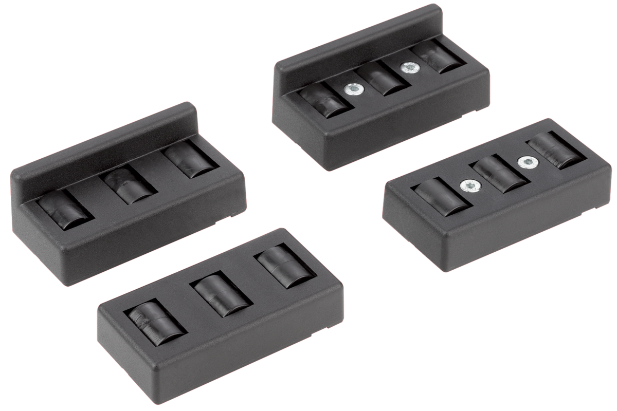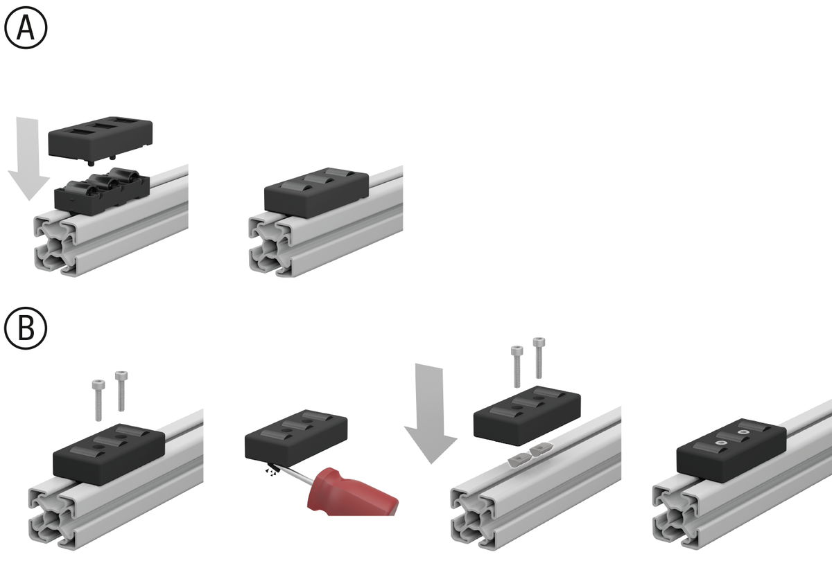 Insert the lower housing part with rollers into the aluminium profile slot. Set the upper housing part on top and press down. Knocking or screwing the screws in locks and clamps the roller element in the slot.