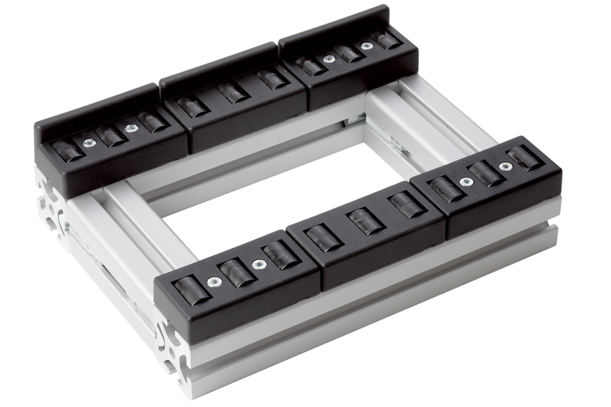 The roller elements are ideal for constructing roller conveyors in any length and width. Suitable for aluminium profiles types B and I. The sprung guide tabs underneath universally match slots sized 8 and 10.