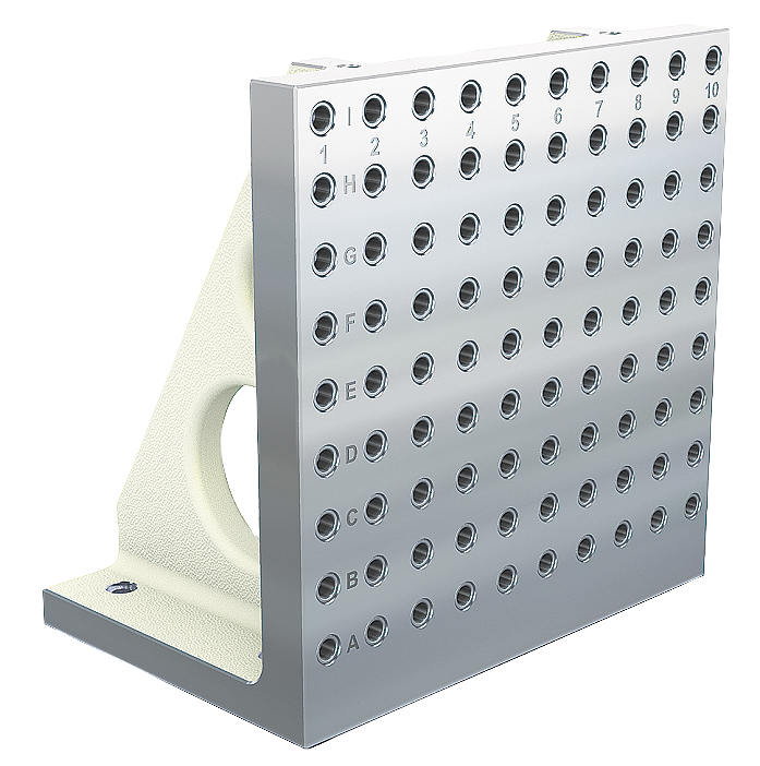 Angle plates are used for the vertical positioning and mounting of workpieces and fixtures. These angle plates with grid holes provide a quick and economic method of clamping workpieces with standardised clamping elements. The alphanumerically labelled grid holes guarantee a defined assignment of clamping elements by repeat setups.