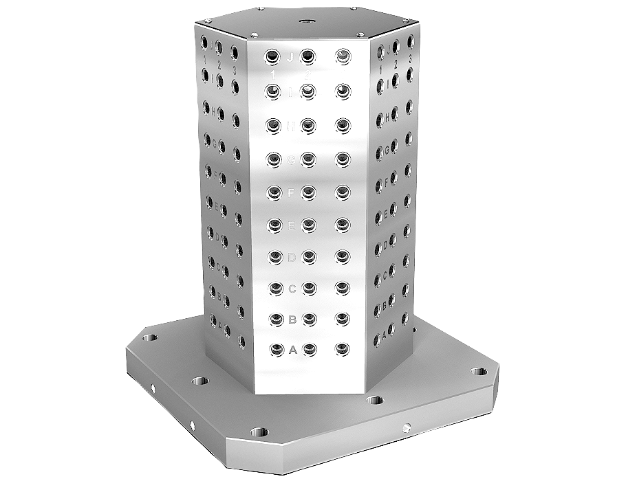 Clamping towers with grid holes are used on horizontal machining centres.