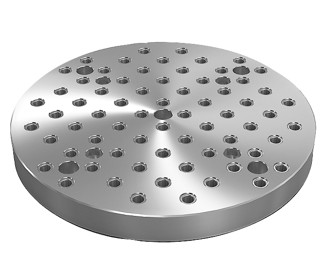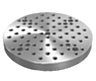 Round baseplates with grid holes are used for setting up modular fixtures. These baseplates are positioned and mounted directly on machine tables.