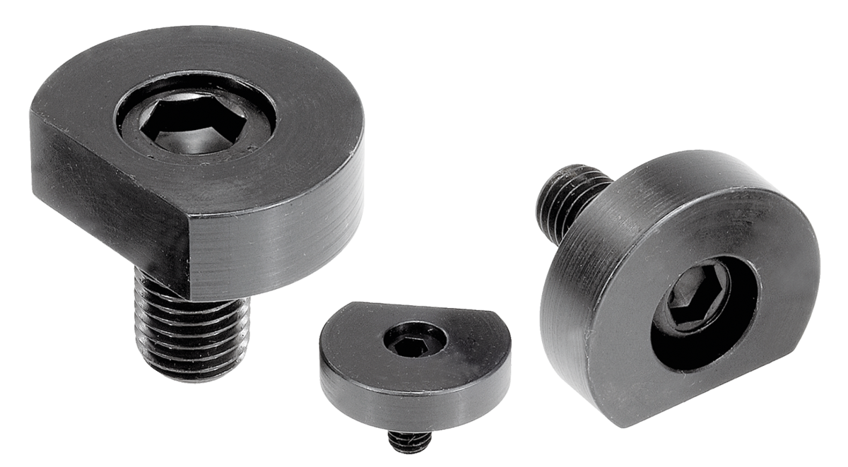 These fixture clamps have a round washer that can be machined to suit the contour of the workpiece being clamped. This allows positive clamping for round, contoured or fragile workpieces. The flat edge is the same distance from the screw centre as our hexagonal fixture clamps 04435 allowing an interchange between the two.