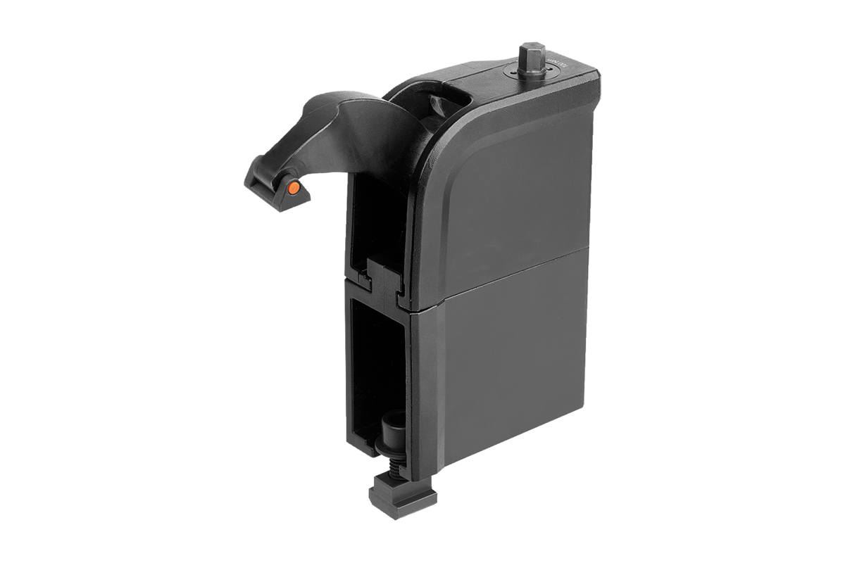 The quick-lock mechanism enables the risers to be connected to each other and to the compact power clamp without screws.