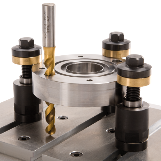 The intermediate plate prevents damage to the machine table, as well as shifting during tightening. The brass clamping ring prevents impressions on the workpiece.