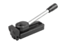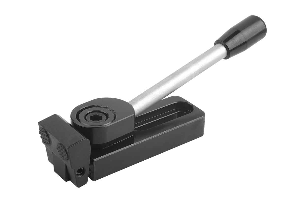 This is a quick-action side clamp where workpieces are clamped by rotating a cam wheel which exerts pressure on the swivel jaw, simultaneously producing a positive down force.