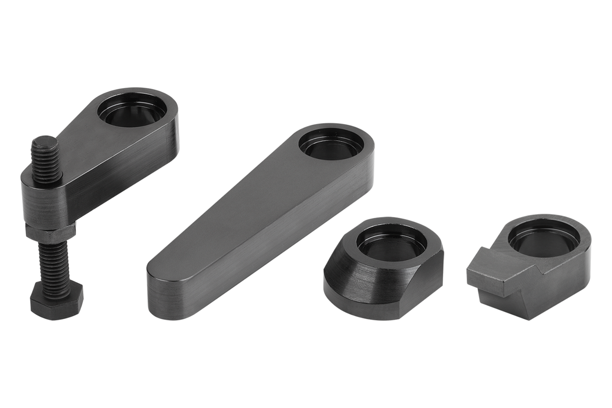 Single clamping arms for the swing clamp 04368-20. Different clamping situations can be realised with the different clamping arm designs. Fastening materials are supplied with the clamping arms.