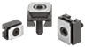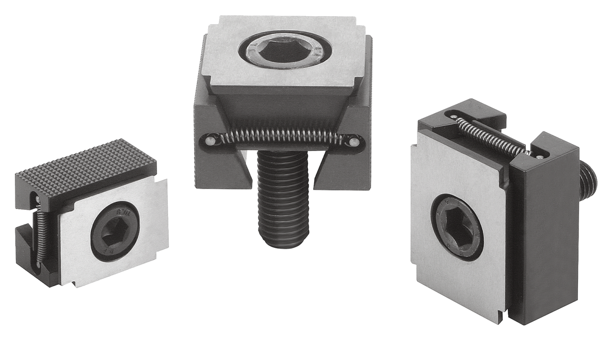 These wedge clamps can be mounted in grid holes or T-slots. Tightening the socket screw moves the wedge down and the jaws out pressing the workpieces against the fixtures fixed stops.