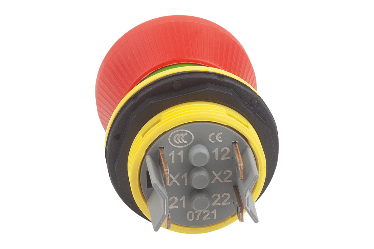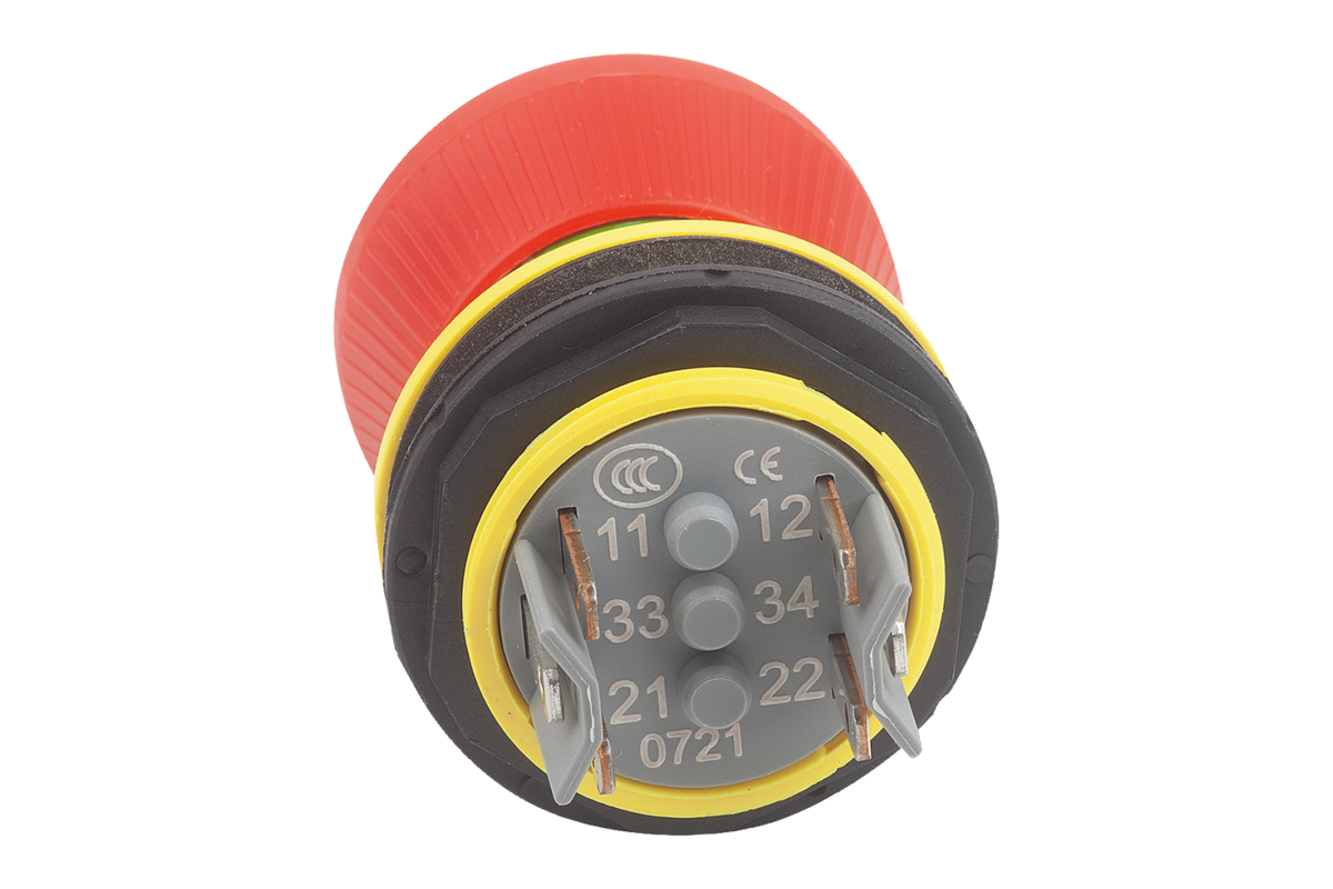 The safety contact ( design with NO contact) constantly monitors the orderly connection between the emergency stop button and the contact element. If the emergency stop button is separated from the contact element due to negligent installation or mechanical damage, the safety contact breaks immediately and the machine is stopped.