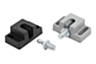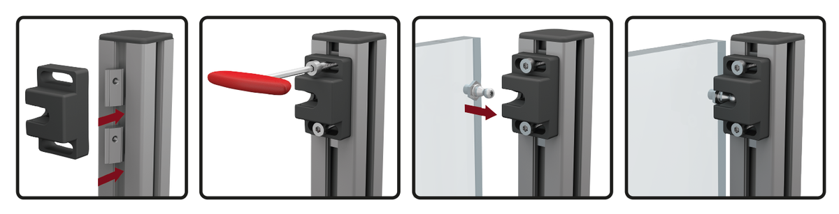 Quick lock for swing and sliding doors. The elongated holes enable flexible positioning on aluminium profiles and panel elements.