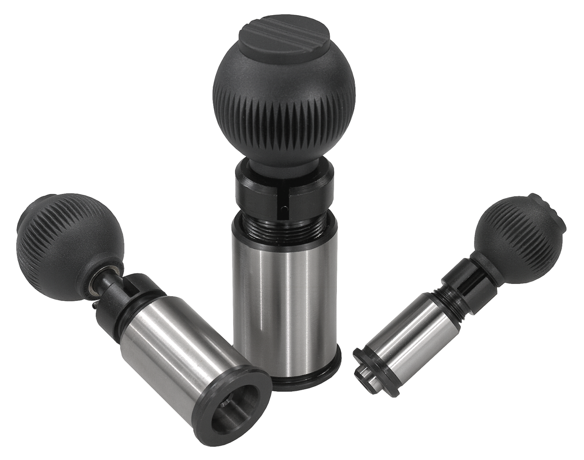 Precision indexing plungers, steel with plastic spherical knob, cylindrical indexing pin and locking slot