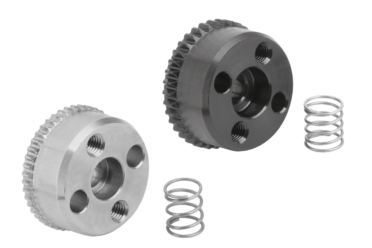 Ratchet elements are used to connect two components together in any angular position with a positive fit. The ratchet elements with internal toothing (Forms A–D) can be combined with the ratchet elements with external toothing (Forms E–H) in any way depending on the application and installation possibilities. The springs mean that a new angular position can be quickly implemented.