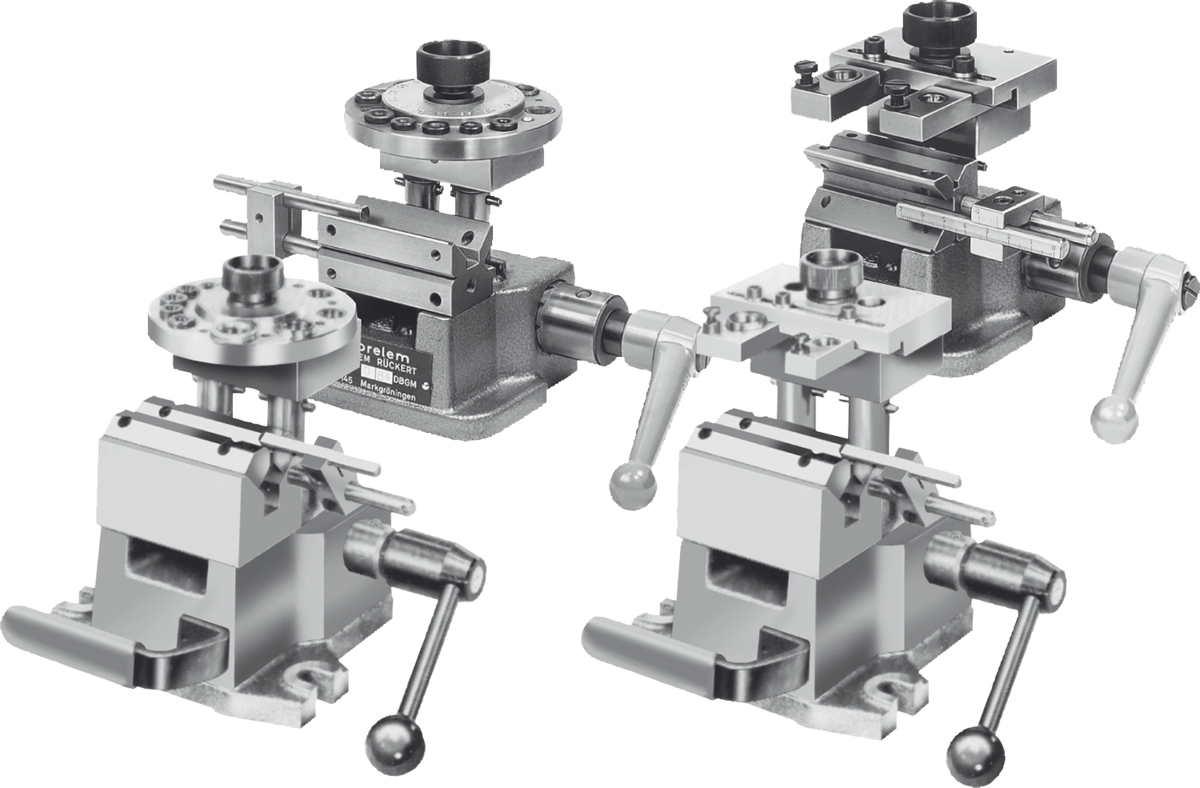 A V-block with adjustable stop with mm divisions and nonius is used in place of the standard support plate. The index drilling discs or drilling bush holders are mounted on the columns. Set-up is very easy and can be done without special technical knowledge.