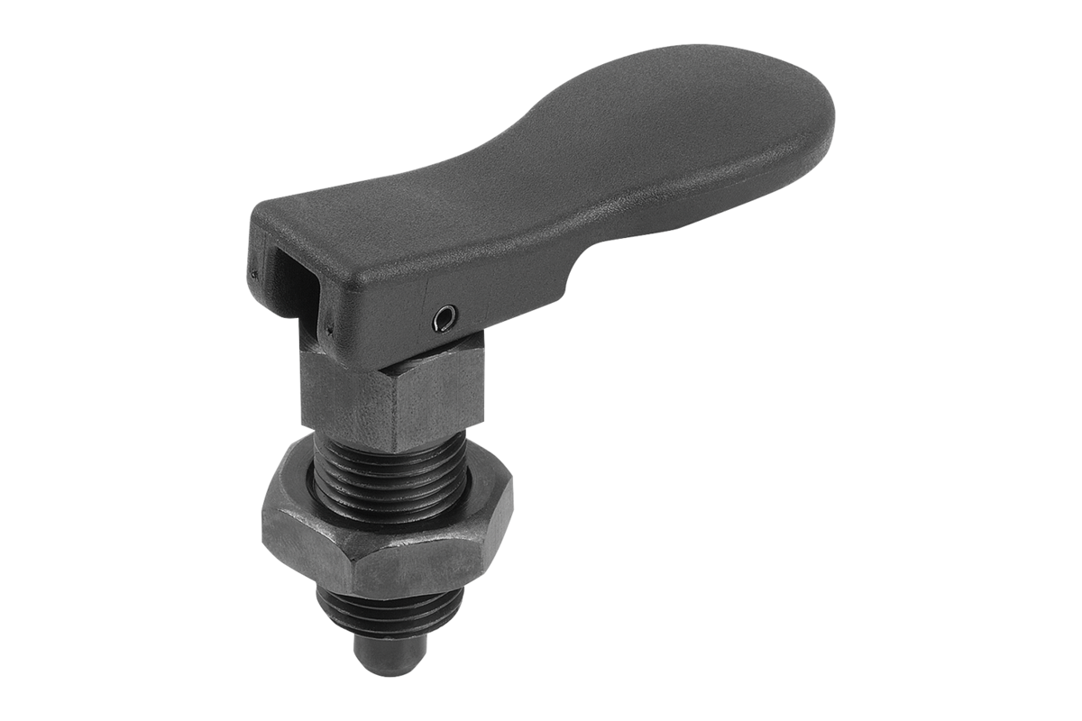 Indexing plungers are used where it is necessary to prevent changes of position due to lateral forces. A new locking position can be set only after the plunger has been manually disengaged. With this indexing plunger a cam lever is used to retract the pin. The indexing plunger remains unlocked as long as the handle is positioned over the dead-centre of the cam.