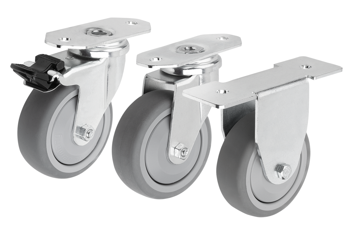 Wheels and castors with a thermoplastic rubber-elastomer tread are often used on factory and shop fittings, as well as on display stands. Other applications include medical equipment, measuring and testing devices, as well as work and assembly stations.