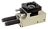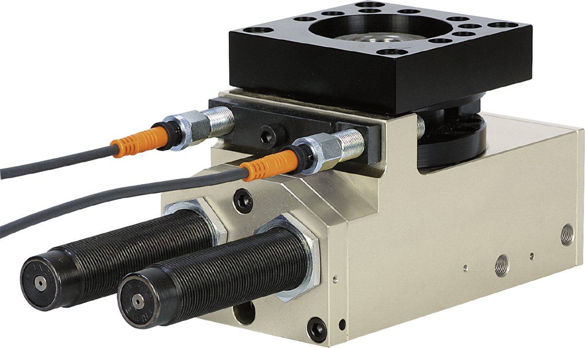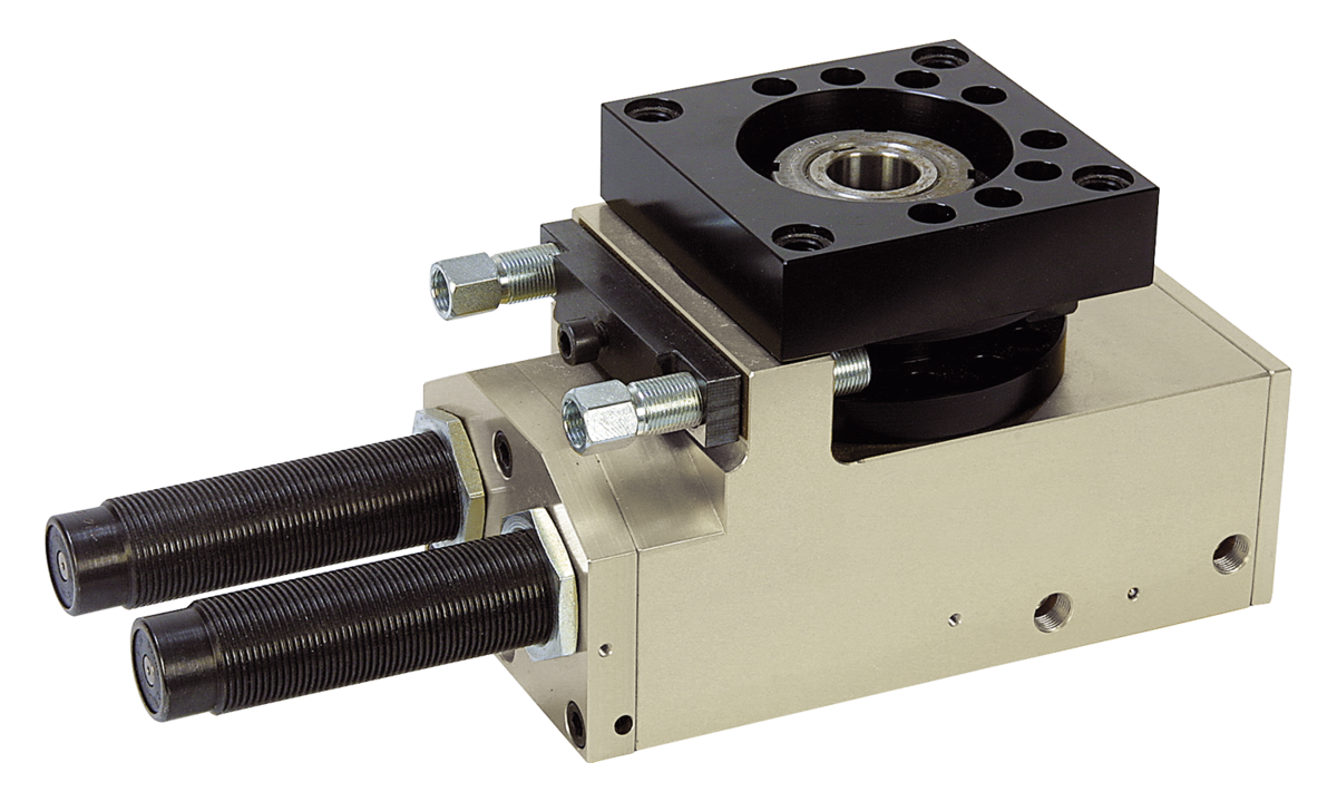 Maintenance-free pneumatic rotary module with double actuated drive cylinder. Control by 4/2 or 5/2 directional valve. Pneumatic drive, 4-8 bar, constant, filtered (10 µm), dried, oiled or unoiled. Compressed air connection R1/8.