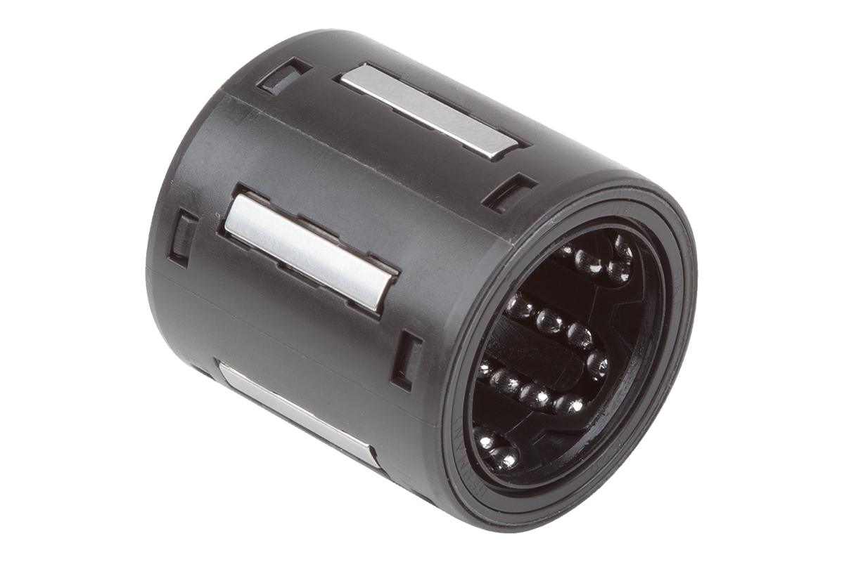 Self-aligning and sealed both ends. These bearings comprise a highly precise die-cast plastic carrier in which the bearing steel, clipped-on raceways are mounted. The plastic carrier also acts as a return and seal retainer. The seal is made from a special polyamide material with a low coefficient of friction. The linear ball bearing is secured using DIN 471/472 circlips.