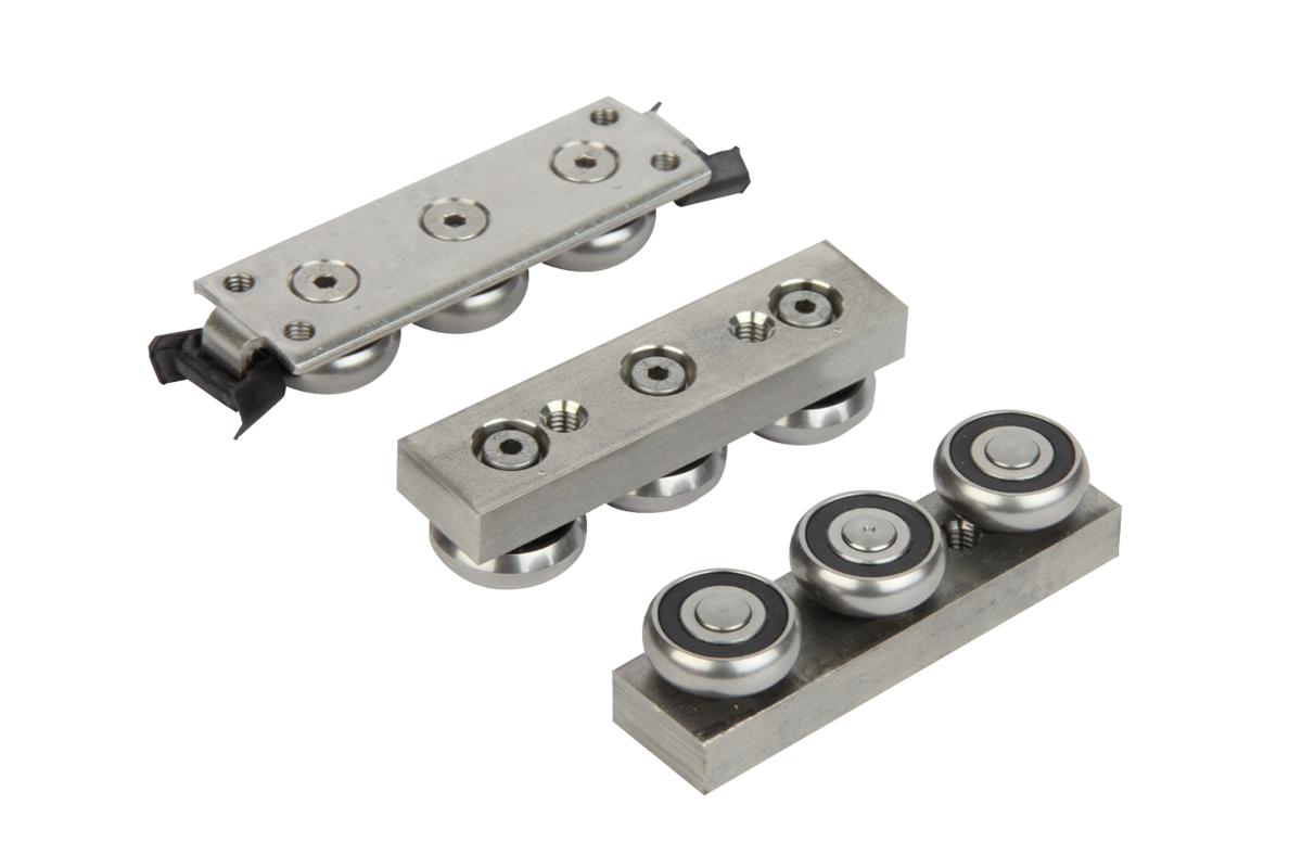 Roller carriage with low coefficient of friction, therefore very free-running. The roller journals are lifetime-lubricated and have a 2Z (dust cover) seal. By simply moving the centre cam roller, the roller carriage can adjusted to be play-free or under the desired initial tension in the rail. The compact version has a plastic stripper for cleaning the tracks.