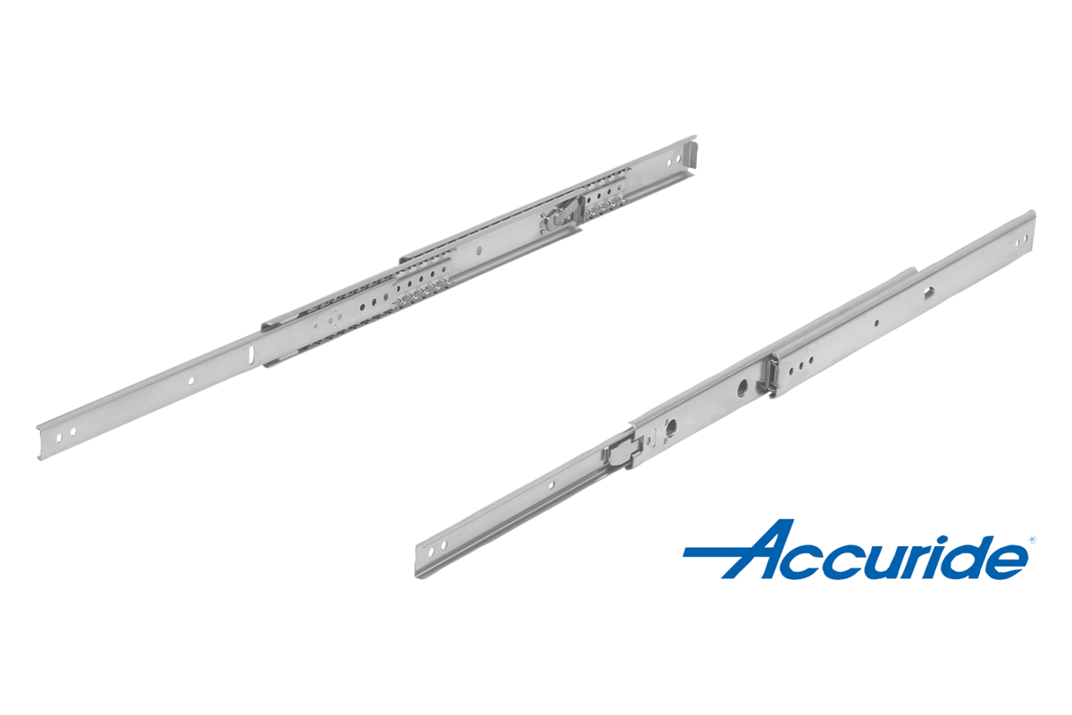 On telescopic slides with over-extension, the travel is greater than the installed length. Latches in open position. When the release lever is actuated, the drawer can be taken out easily and separated from the guide.