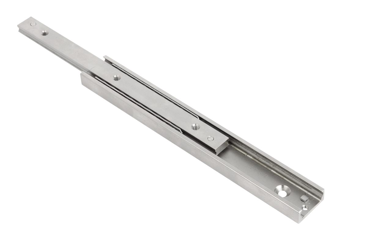 Partial extension consisting of a fixed guide rail and a movable runner. The slide can move somewhat more than half the length of the rail (S travel). By removing the locking screw, a partial extension with the travel length S is possible to both sides. The total travel is thus 2S .