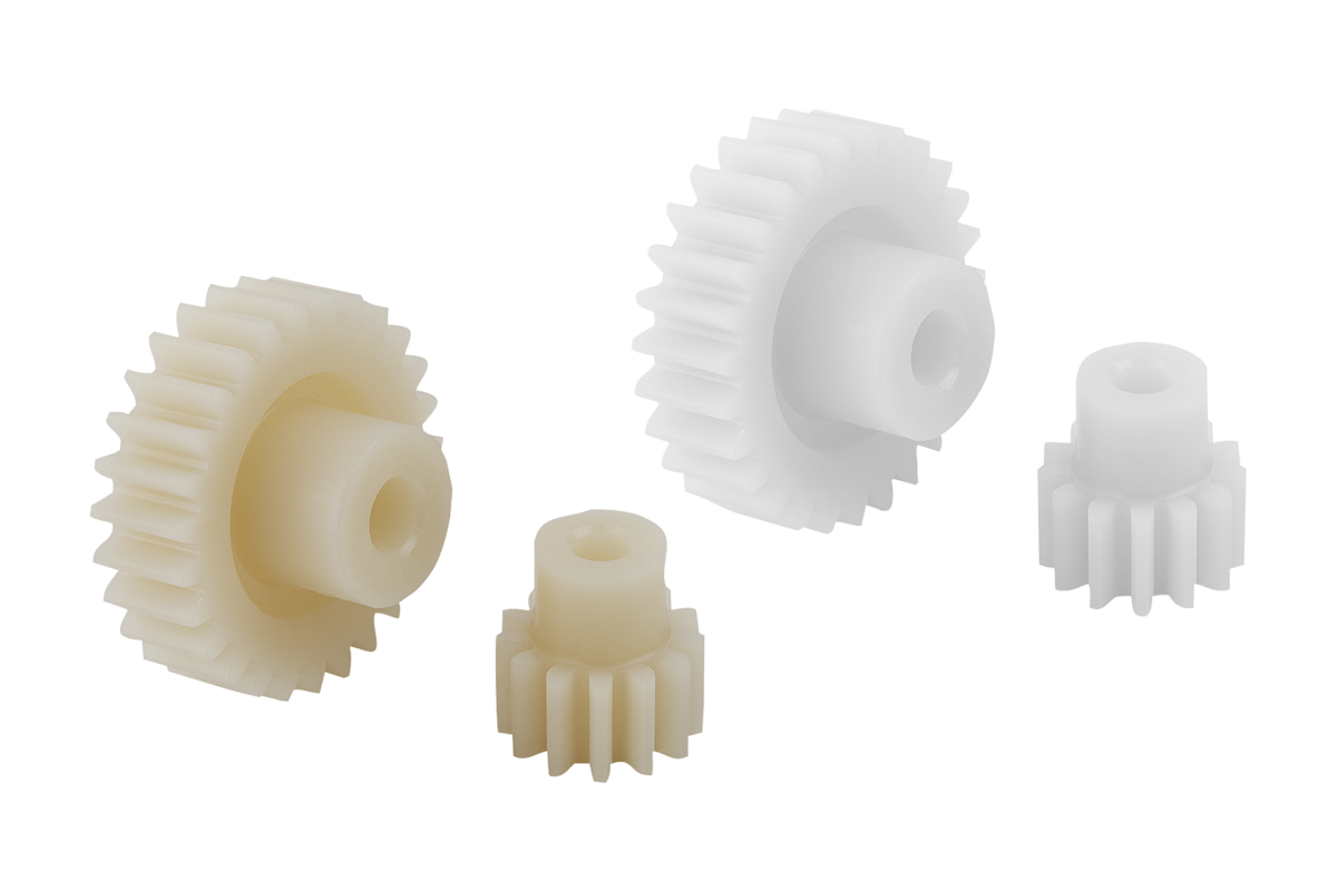 Injection moulded, straight teeth. Engagement angle 20°. Machined bore.