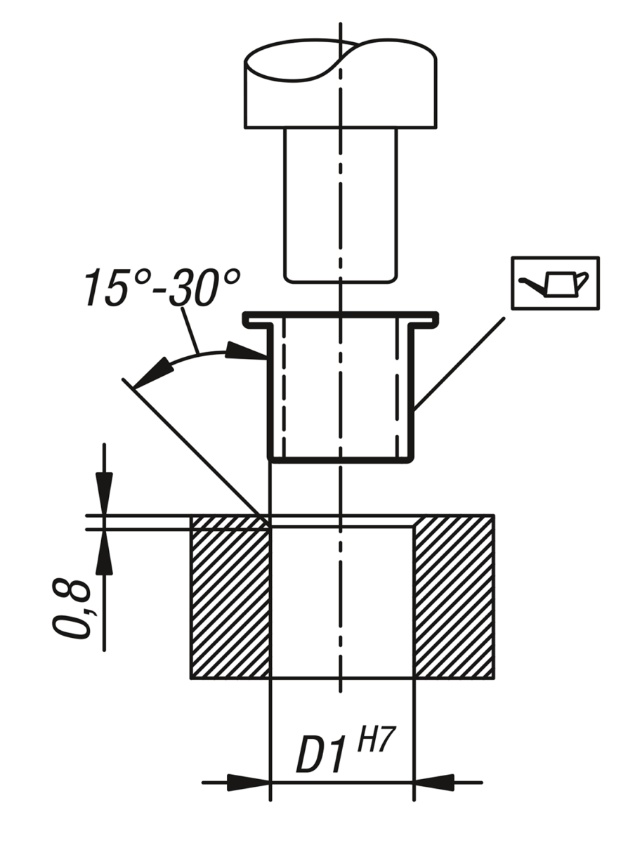 Chamfer (press-in side 0.8 to 1.2 x 15°).