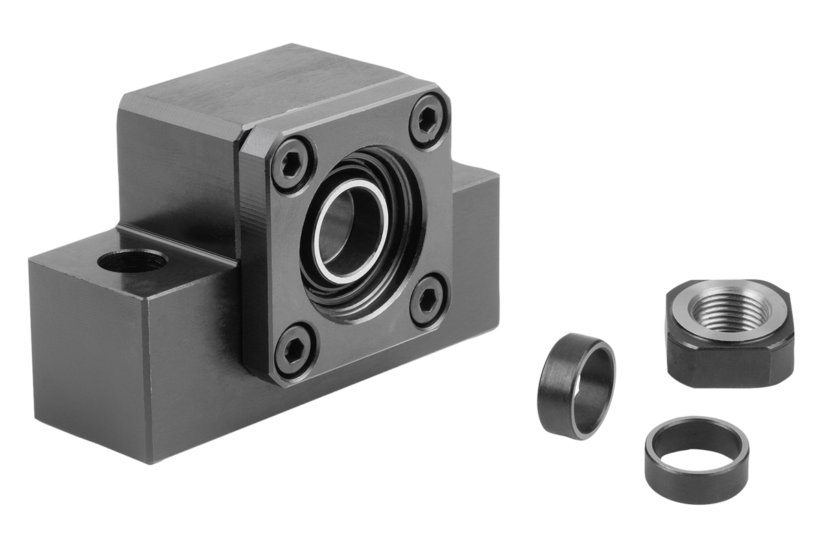 The axis height of the spindle bearings matches the floating bearing unit 24078-02. The solid bearing units are composed of a housing with 2 axial angular contact ball bearings with seals. Pre-stressed with a prefixed flange. With circlips and a lock nut.