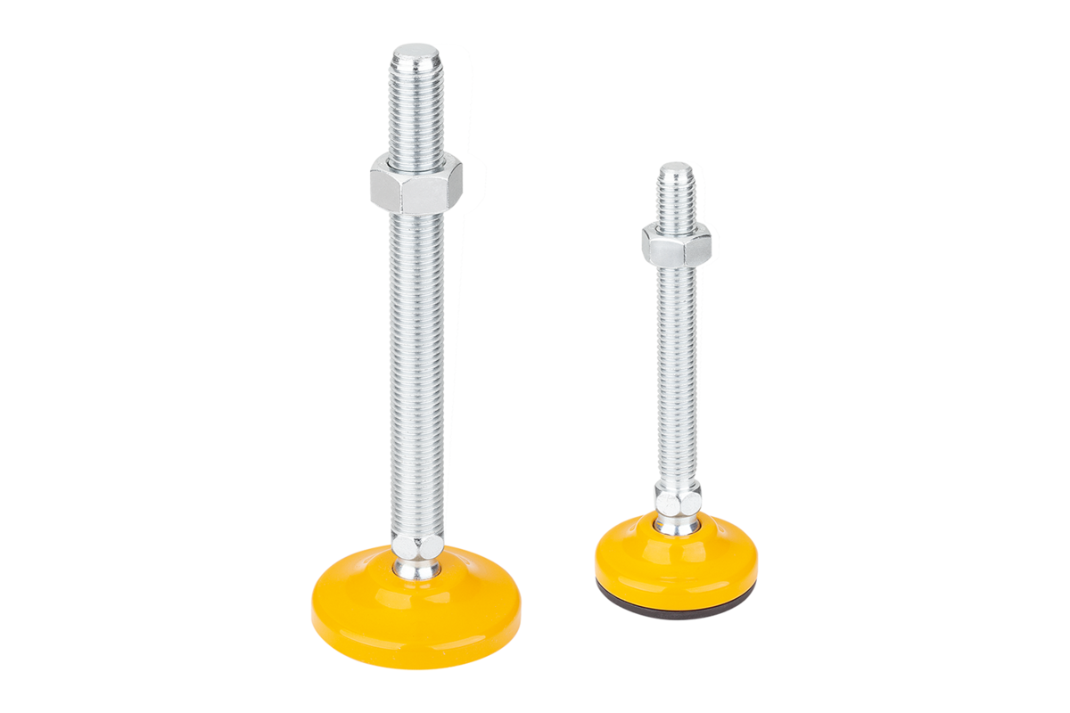 High load rated steel swivel feet with yellow painted plate, optional with an anti-slip plate. The anti-slip plate absorbs vibrations and prevents the swivel foot slipping.