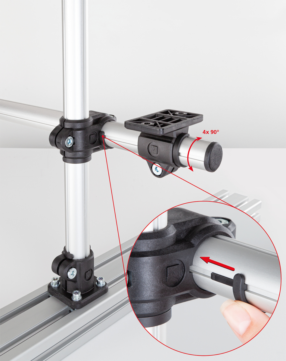 The rotation lock, when used in conjunction with plastic tube clamps and round tubes with slots, ensures a secure fastening.