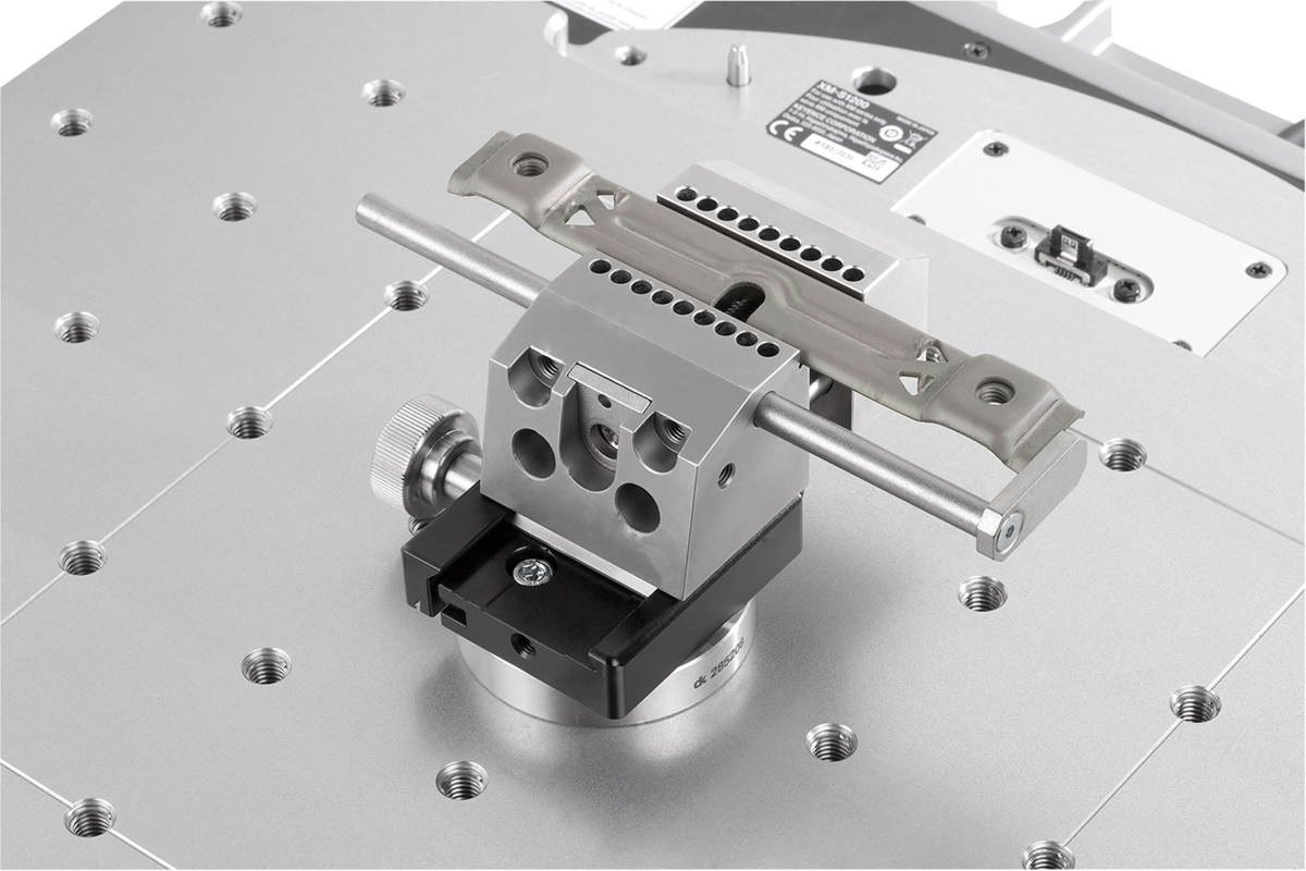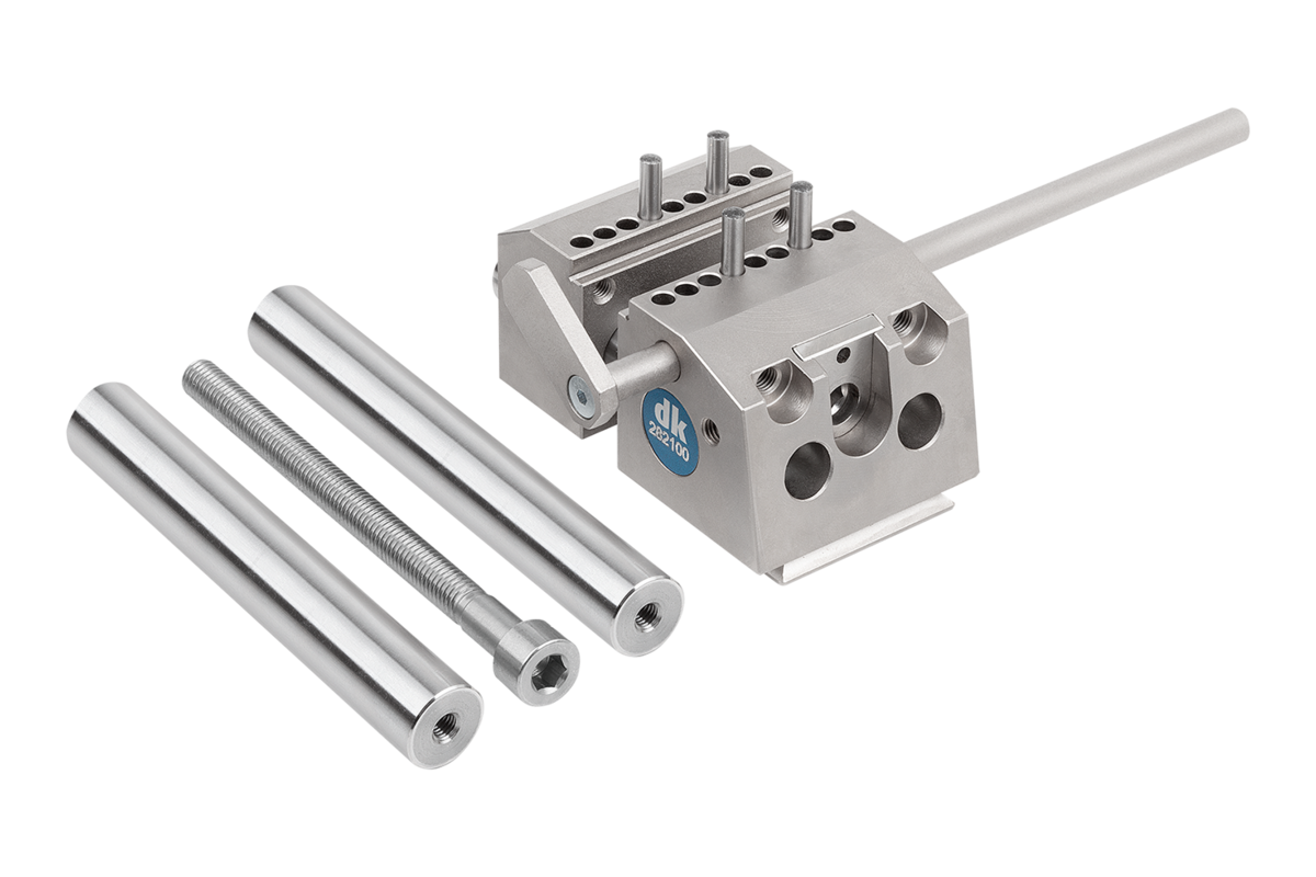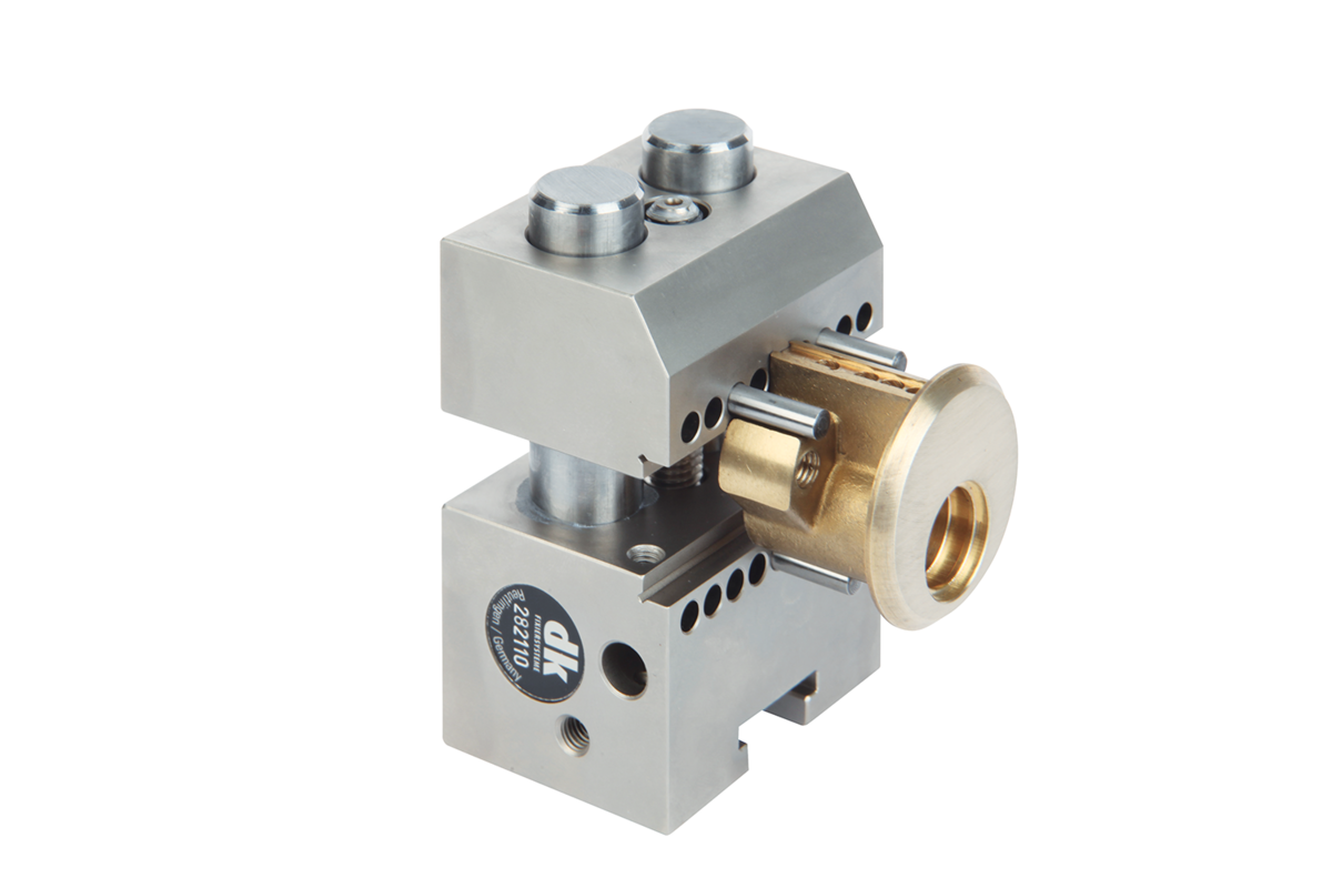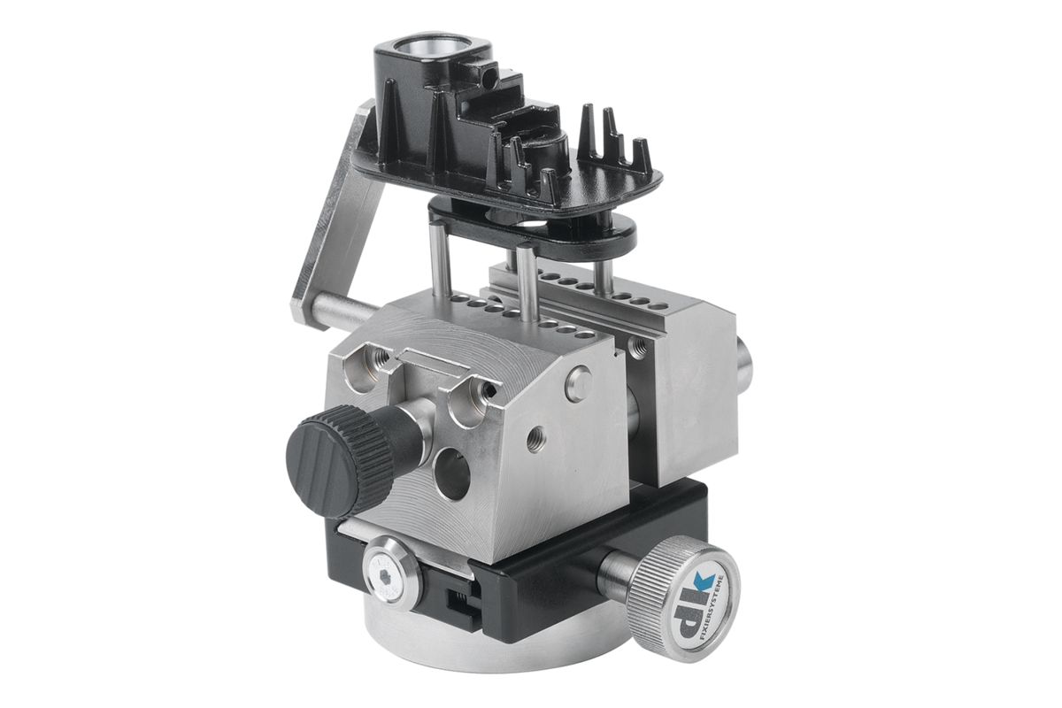 L’étau de précision est une solution flexible permettant de positionner et de fixer facilement et rapidement des pièces pour les mesurer sur des machines de mesure. Le serrage peut être réalisé au moyen de mors déportés ou de broches enfichables dans les mors. Il est ainsi également possible de serrer des pièces avec alésage intérieur. Les colonnes de guidage interchangeables permettent d’accroître la portée de 35 mm à 75 mm.