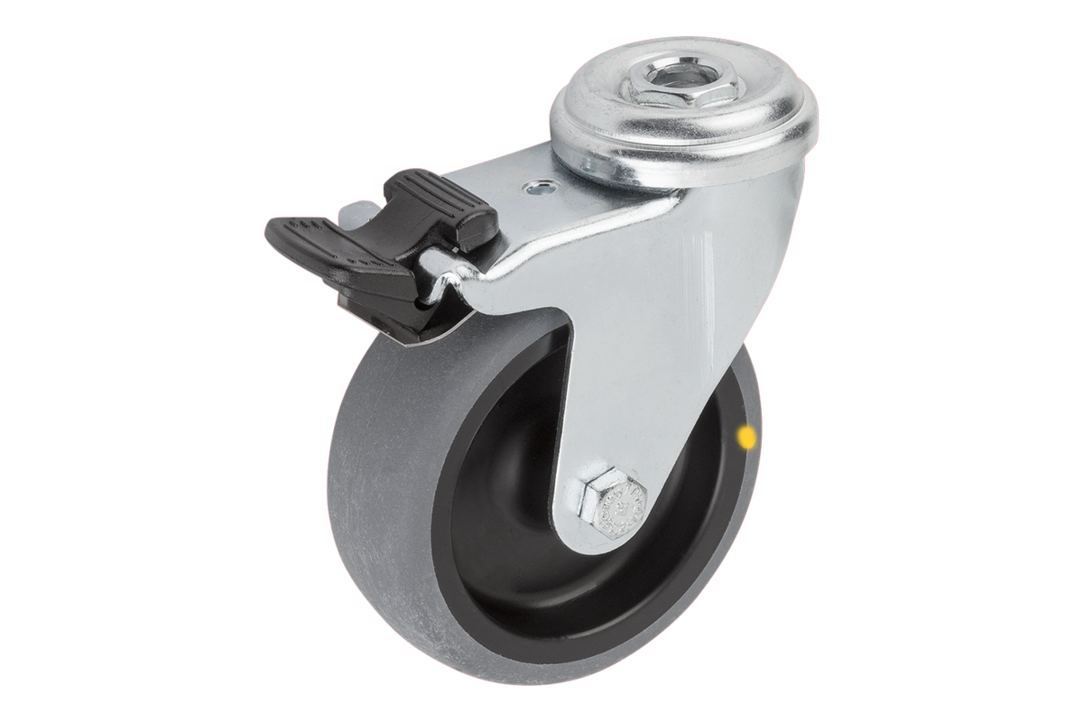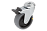 Axe vissé. Roues orientables avec trou de fixation. Bandage conducteur d'électricité lisse, gris. La résistance ohmique de la roue est inférieure à 10⁴ Ω.
