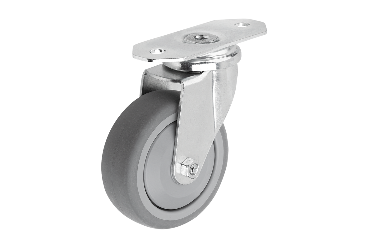Leur bande de roulement en polypropylène thermoplastique (TPE) de haute qualité possède une dureté de 85° Shore A et est moulée par injection sur un corps de roue en polypropylène. Cette bande de roulement ne laisse pas de traces et forme une entité matérielle indissociable avec le corps de roue. Les roulettes en élastomère de caoutchouc thermoplastique se caractérisent par une très faible résistance au roulement et au braquage.
