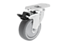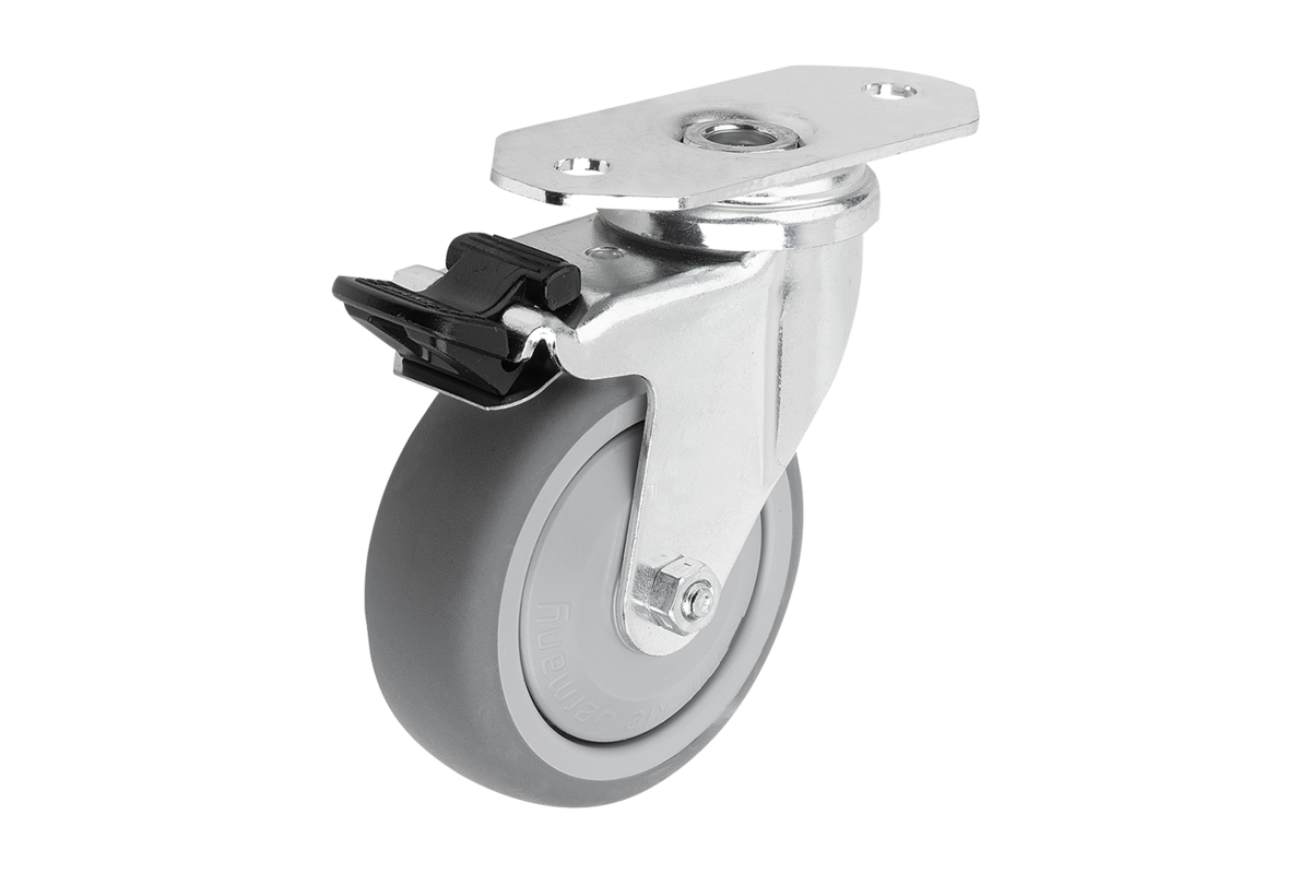 Leur bande de roulement en polypropylène thermoplastique (TPE) de haute qualité possède une dureté de 85° Shore A et est moulée par injection sur un corps de roue en polypropylène. Cette bande de roulement ne laisse pas de traces et forme une entité matérielle indissociable avec le corps de roue. Les roulettes en élastomère de caoutchouc thermoplastique se caractérisent par une très faible résistance au roulement et au braquage.