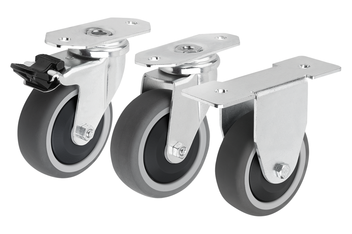 Ces roulettes avec bande de roulement en polyuréthane thermoplastique sont utilisées pour les chariots à outils, les roulettes de sol ou dans les locaux sanitaires, notamment dans l’industrie alimentaire.