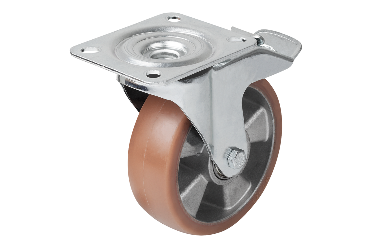 Corps embouti. Corps de roue orientable avec double roulement à billes dans la couronne de pivotement. Roues avec roulement à billes.