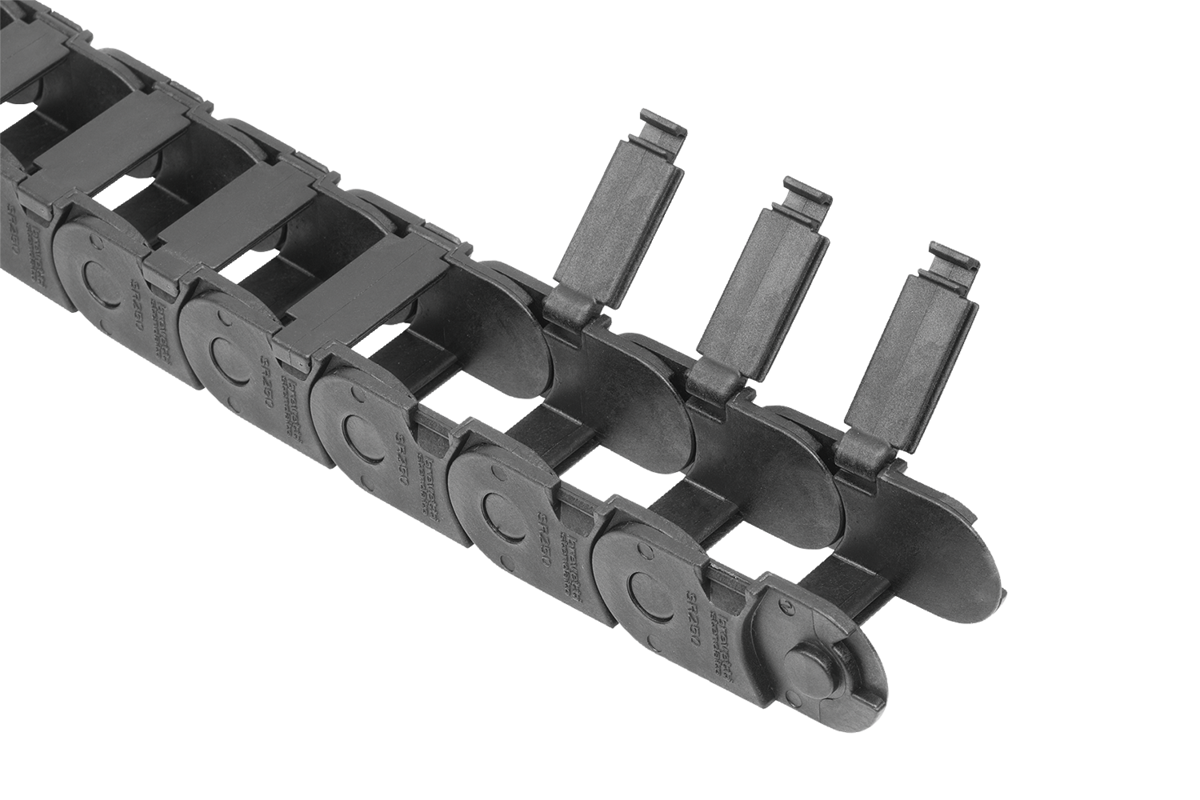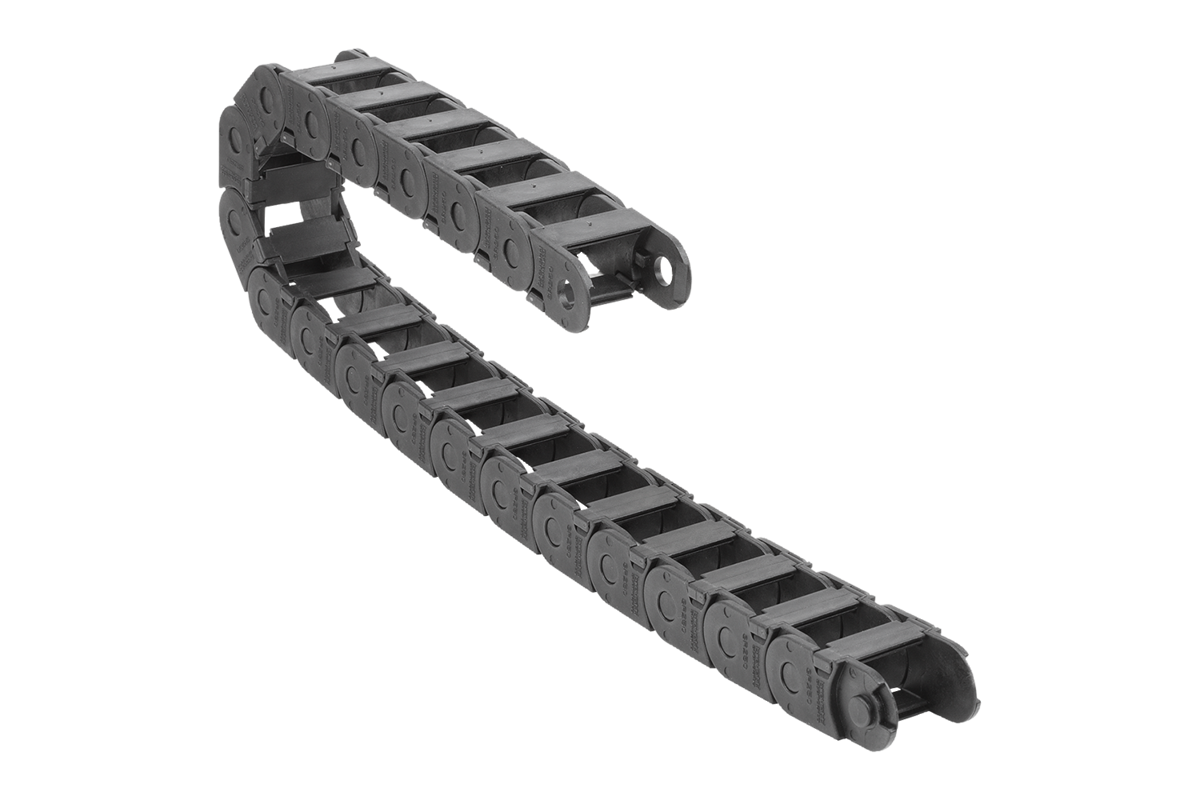Chaîne porte-câbles pour un guidage en toute sécurité des câbles d'alimentation et de données flexibles, ainsi que des tuyaux pneumatiques et hydrauliques. Cette chaîne modulaire peut être facilement raccourcie ou allongée.