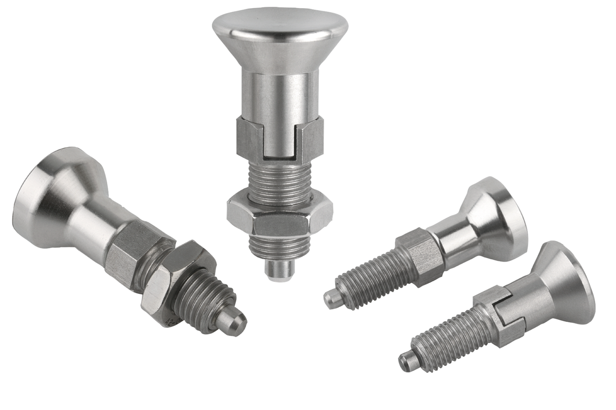 Doigt d'indexage en inox avec bouton de manœuvre en inox. Encoche d'arrêt et contre-écrou - inch