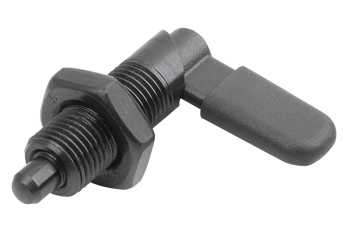 Les doigts d’indexage verrouillables sont utilisés lorsqu'il faut éviter tout déplacement de la position d'arrêt sous l'effet de forces transversales. Une rotation à 180° du verrou entraîne la rétractation du doigt d'arrêt, ce qui permet de modifier la position d'arrêt. L'encoche d’arrêt permet de maintenir le verrou dans cette position et le doigt d'arrêt rétracté.