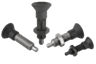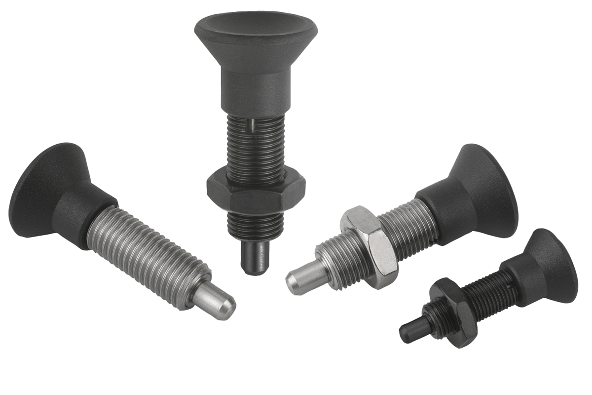 Doigt d'indexage en acier ou en inox sans embase avec bouton de manœuvre en plastique, doigt d'arrêt allongé et contre-écrou - inch
