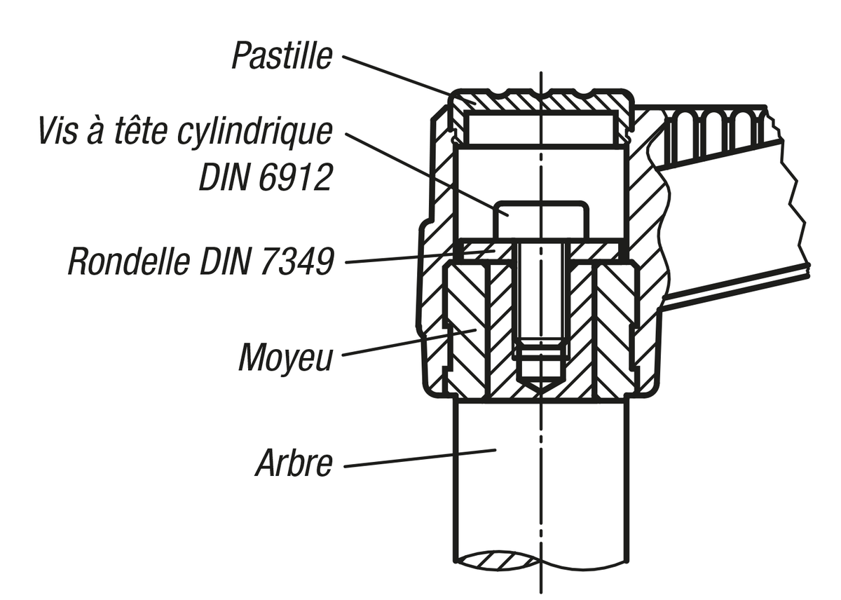 Le cache du moyeu est livré non monté. Les manivelles se fixent suivant le sens axial sur l’arbre soit à l’aide d’une goupille transversale, soit à l’aide d’une vis à tête cylindrique DIN 6912 et d’une rondelle DIN 7349.