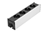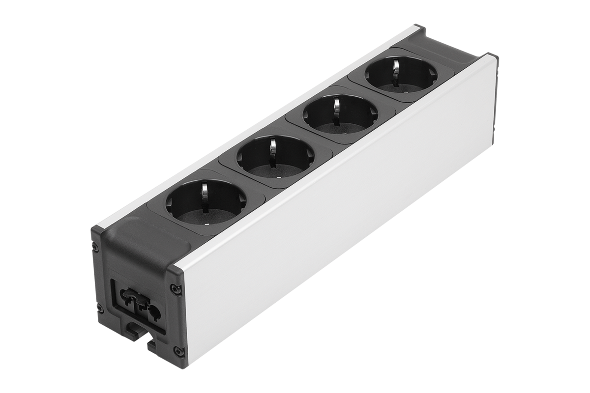 Blocs de prises de qualité industrielle robuste pour l'alimentation électrique des postes de travail. Les prises sont enchâssées dans un profilé en aluminium avec rainure 8 de type I à l'arrière. Cette rainure permet de les fixer sur des rainures de profilé et sur des éléments de surface à l'aide des accessoires disponibles séparément.