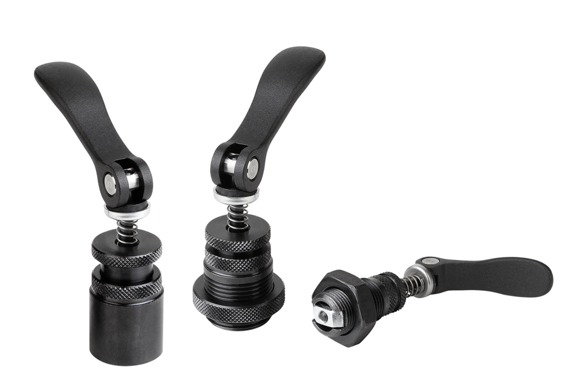 Corps de base bruni. Écrou type marteau, zingué. Levier à serrage rapide avec revêtement de poudre noire.