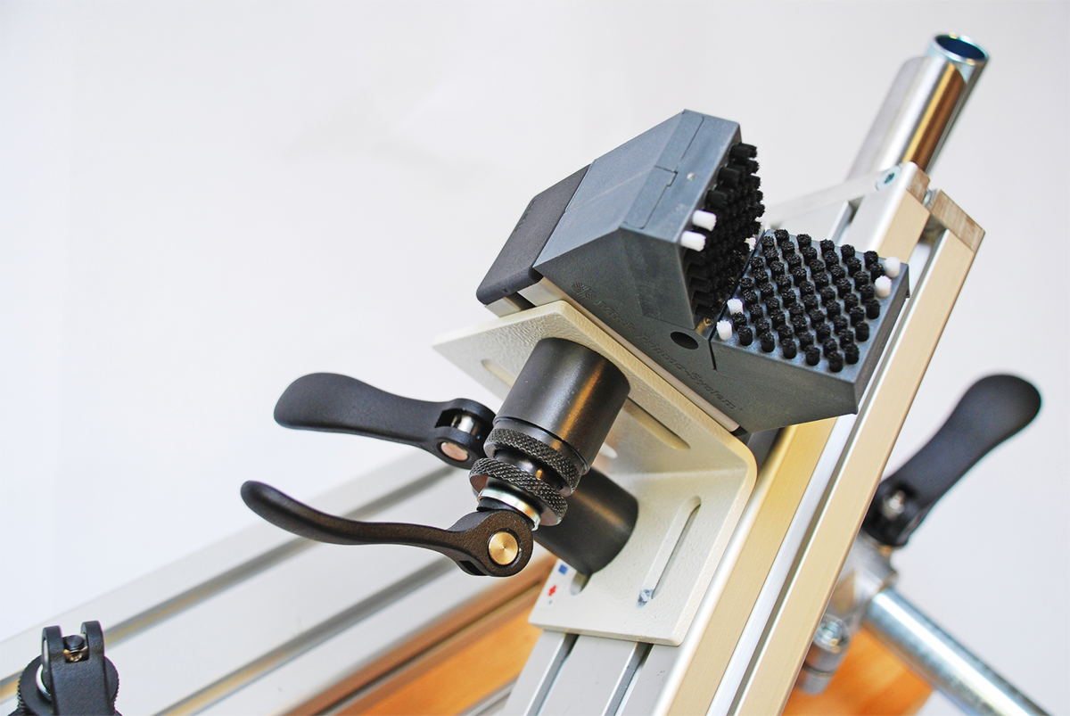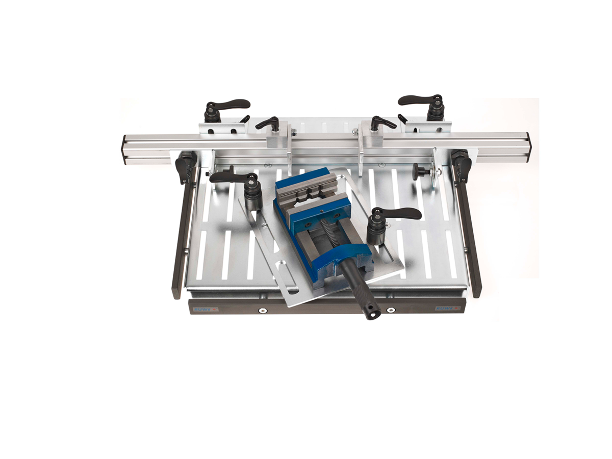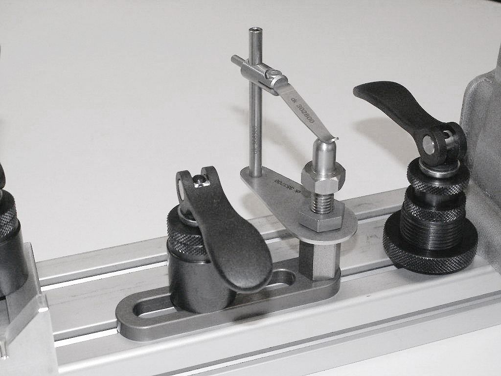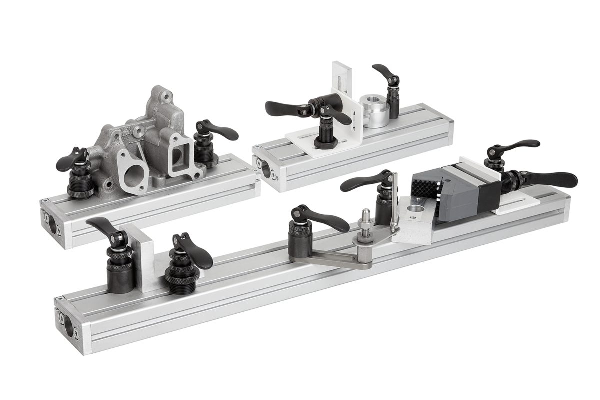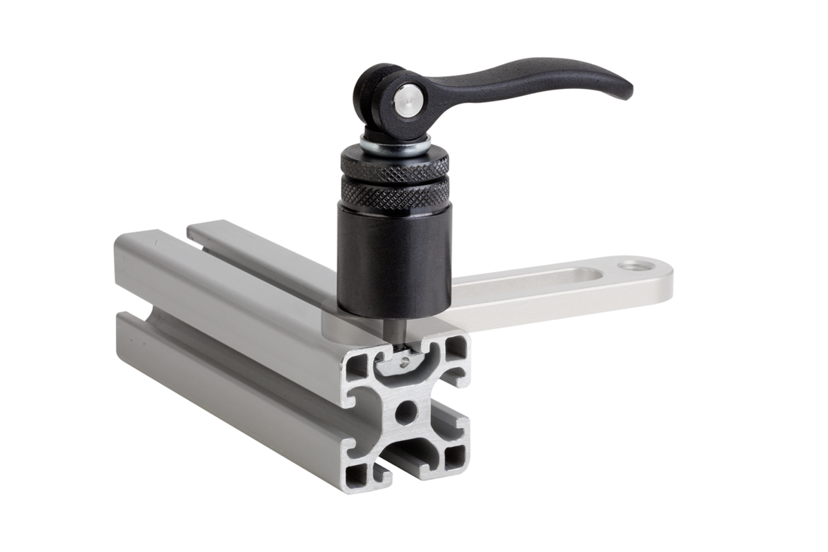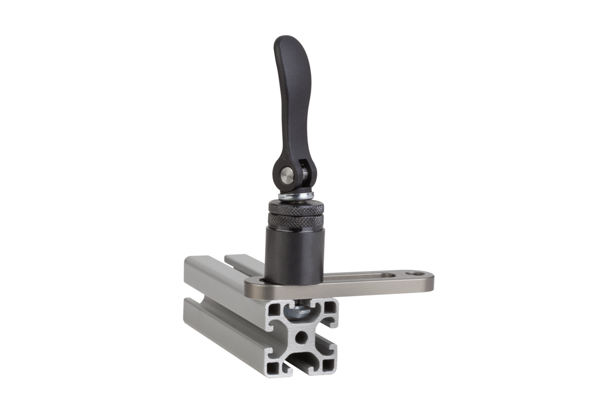 Le module de serrage est positionné par le dessus dans la rainure en T et serré en toute sécurité via le levier à serrage rapide, sans aucun outil supplémentaire.