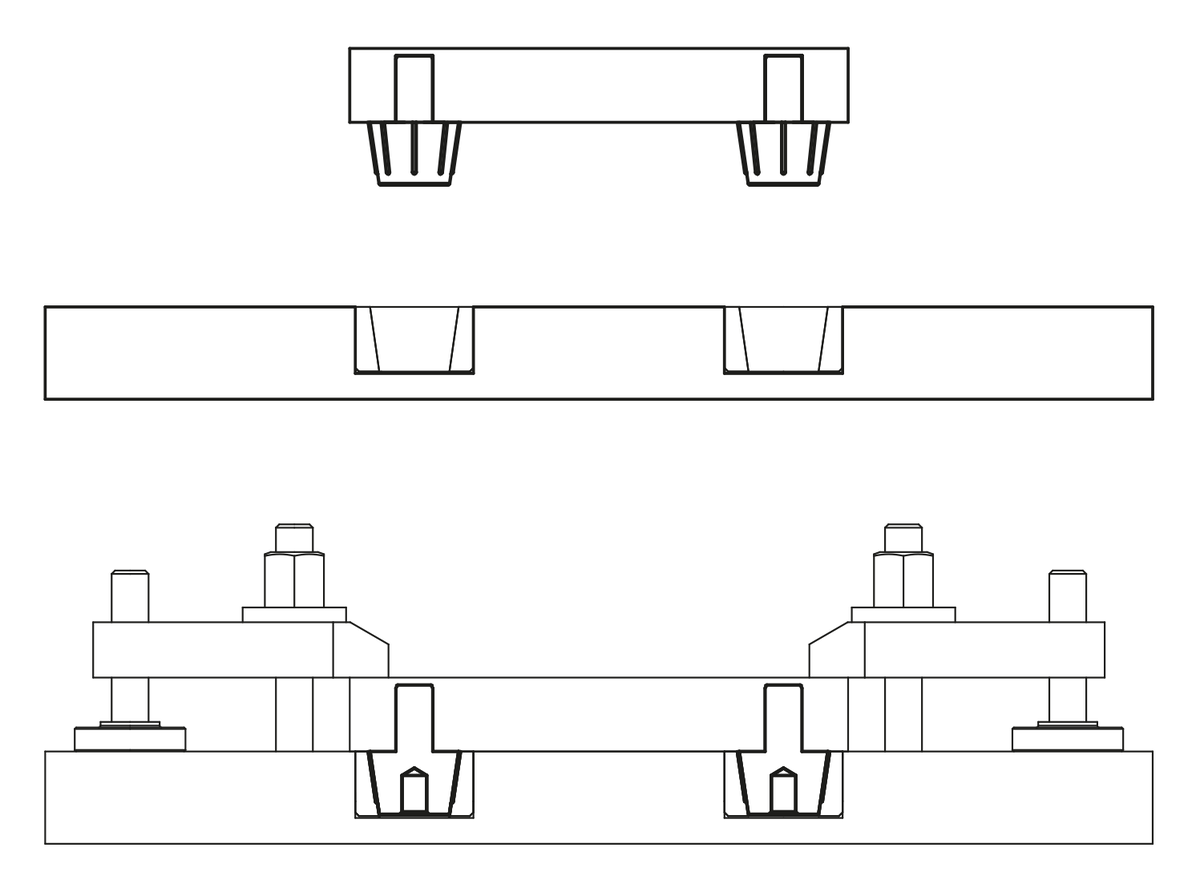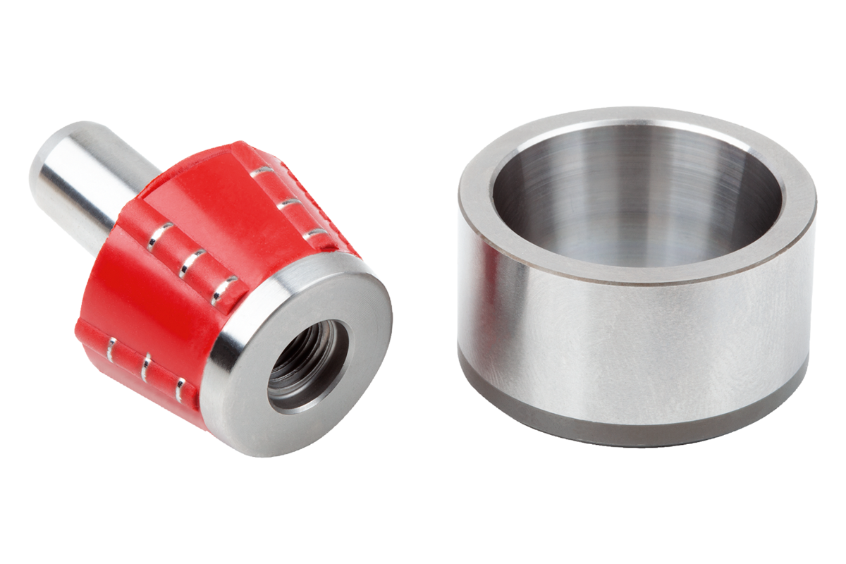 Les cônes de positionnement, associés aux douilles de positionnement, forment une unité de centrage pour un positionnement très précis de deux composants. L'ensemble atteint une précision de répétition < 0,003 mm. Le caoutchouc vulcanisé ne se fragilise pas et est insensible aux salissures et aux copeaux. Les petits copeaux enfoncés sont sans danger pour l'unité.