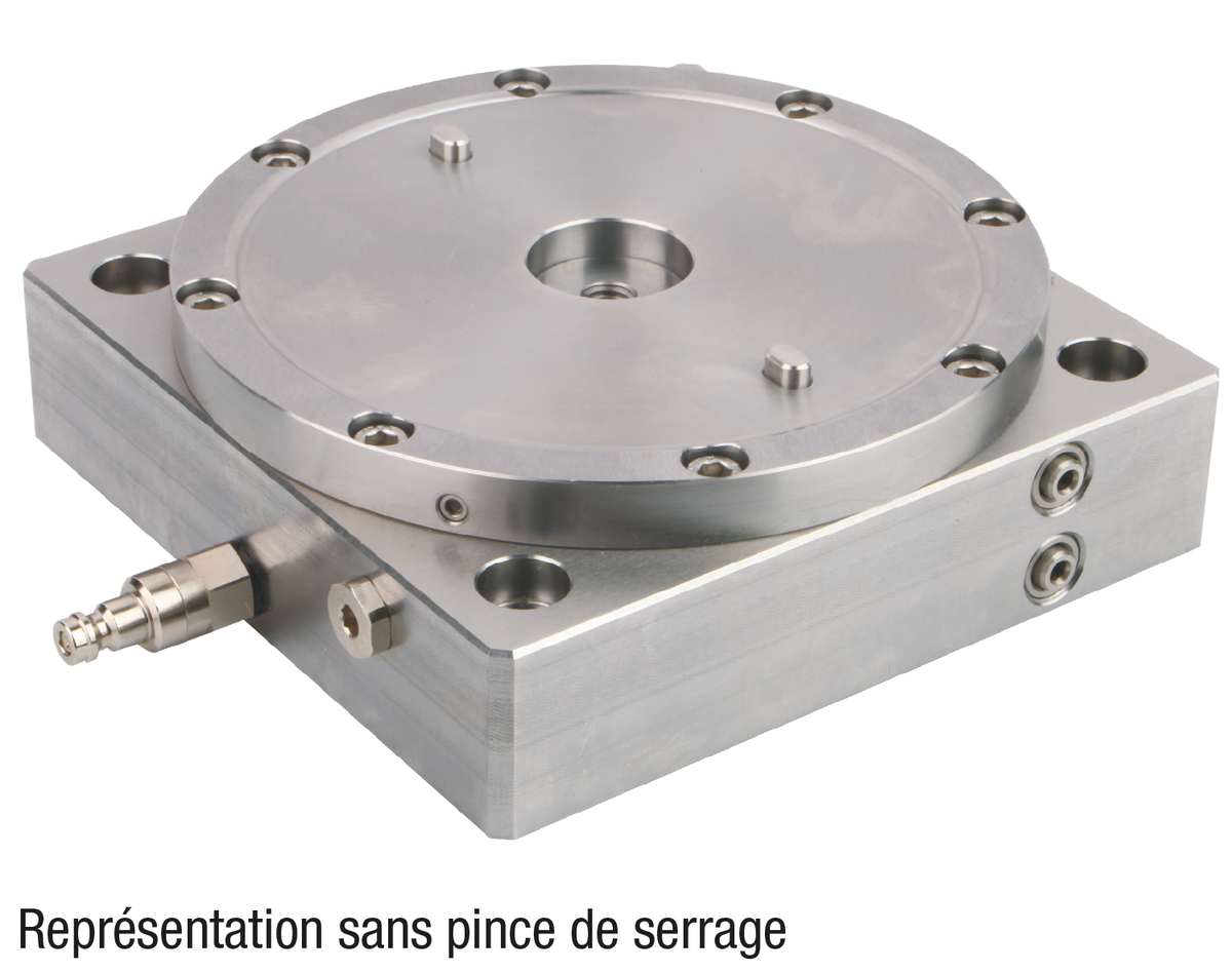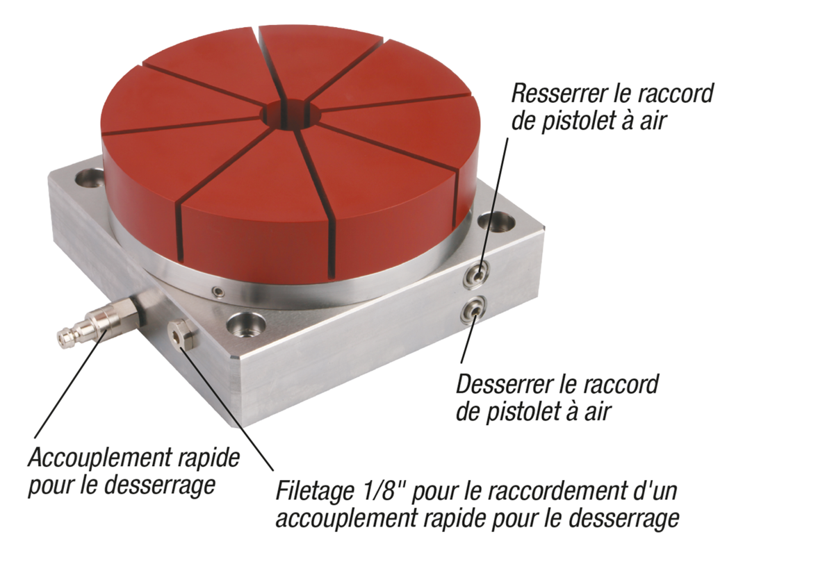 Le pack de ressorts intégré génère une force de serrage de 5,8 kN. Grâce à un resserrage à l'air comprimé, la force de serrage peut être augmentée jusqu'à 43,5 kN. Le desserrage de la pince s'effectue par injection d'air comprimé sur la surface inférieure du cylindre. Le cylindre est alors poussé vers le haut et annule ainsi le processus de serrage de la pince de serrage.