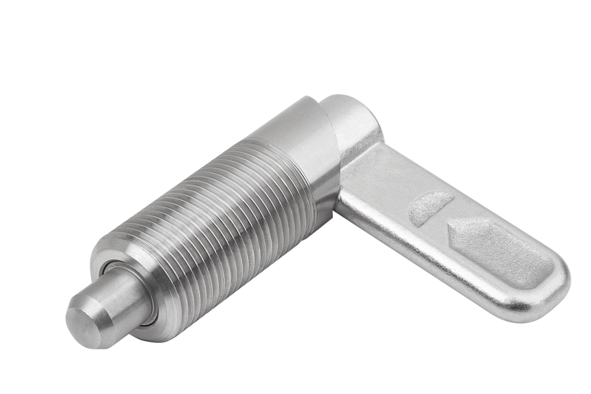 Les doigts d’indexage verrouillables sont utilisés lorsqu'il faut éviter tout déplacement de la position d'arrêt sous l'effet de forces transversales. Une rotation à 180° du verrou entraîne la rétractation du doigt d'arrêt, ce qui permet de modifier la position d'arrêt. L'encoche d’arrêt permet de maintenir le verrou dans cette position et le doigt d'arrêt rétracté.