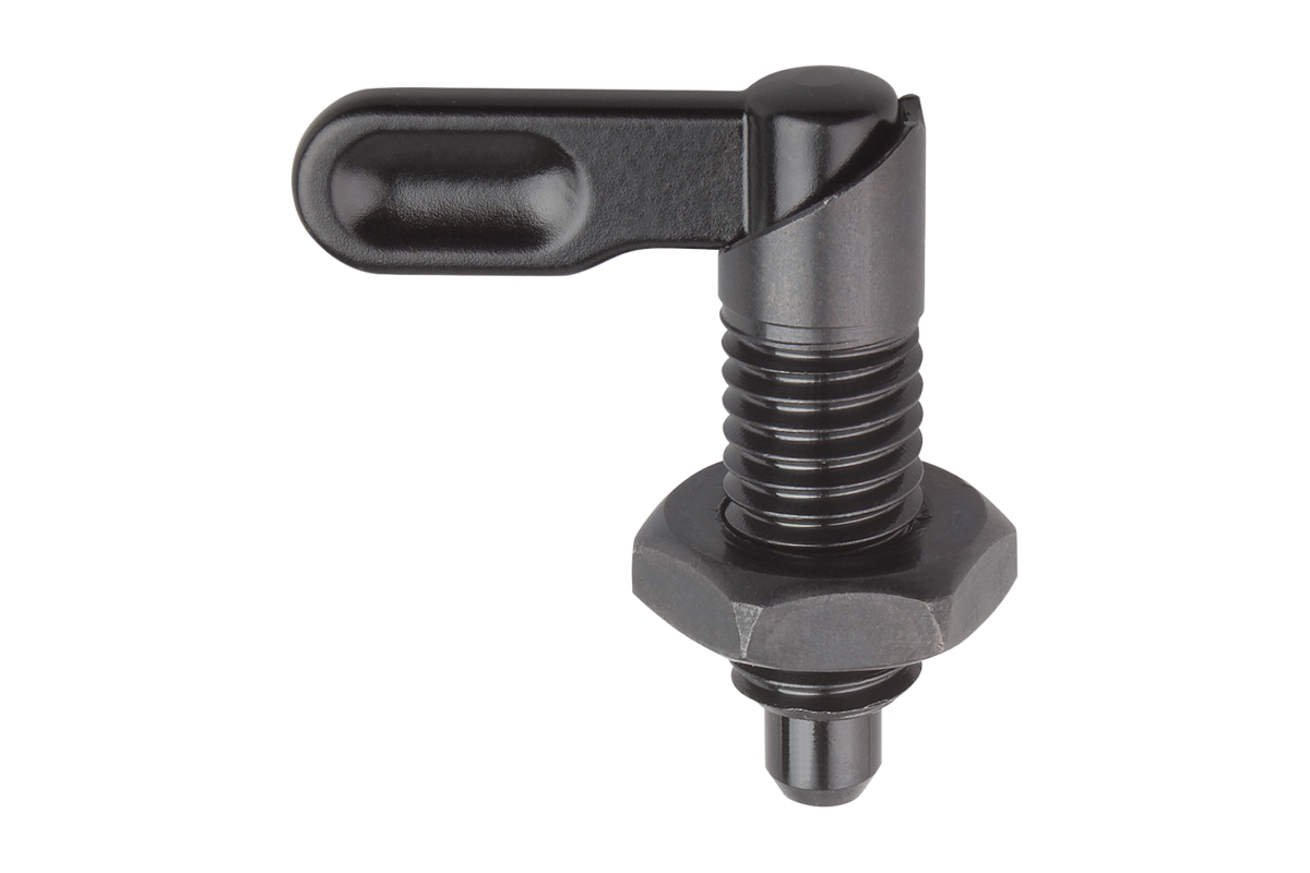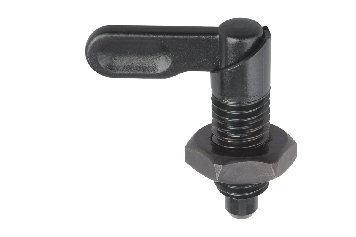 Les doigts d’indexage verrouillables sont utilisés lorsque l'application nécessite parfois que le doigt soit rétracté. Tourner le levier de 180° pour enclencher le verrouillage. Une encoche d’arrêt permet de maintenir le levier dans cette position.