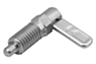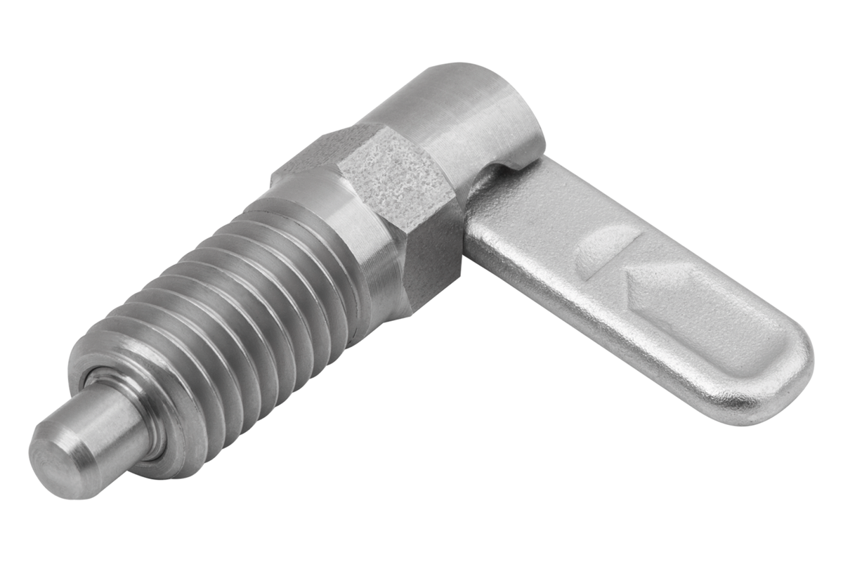 Les doigts d’indexage verrouillables sont utilisés lorsqu'il faut éviter tout déplacement de la position d'arrêt sous l'effet de forces transversales. Une rotation à 180° du verrou entraîne la rétractation du doigt d'arrêt, ce qui permet de modifier la position d'arrêt. L'encoche d’arrêt permet de maintenir le verrou dans cette position et le doigt d'arrêt rétracté.