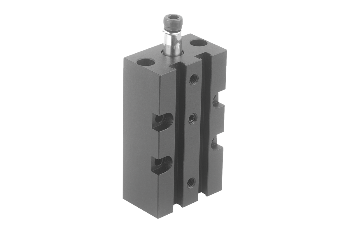 Le piston à détection magnétique permet l‘utilisation de détecteurs de fin de course. La vis et la rondelle élastique sont fournis pour la fixation du bras de serrage accessoire. Le vérin de bridage pivotant ne doit pas être gêné lors du mouvement de rotation.